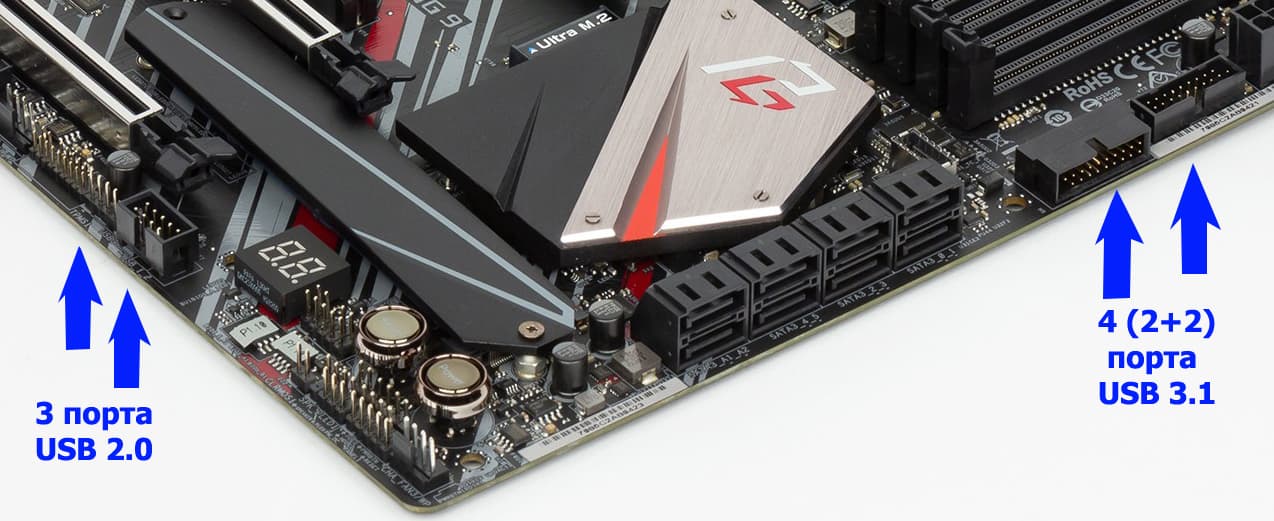 На картинке ниже хорошо видны 2 разъема: один сдвоенный на 2 порта USB 2.0 и один одинарный. Всего у нас получилось 12 портов USB через Z390.