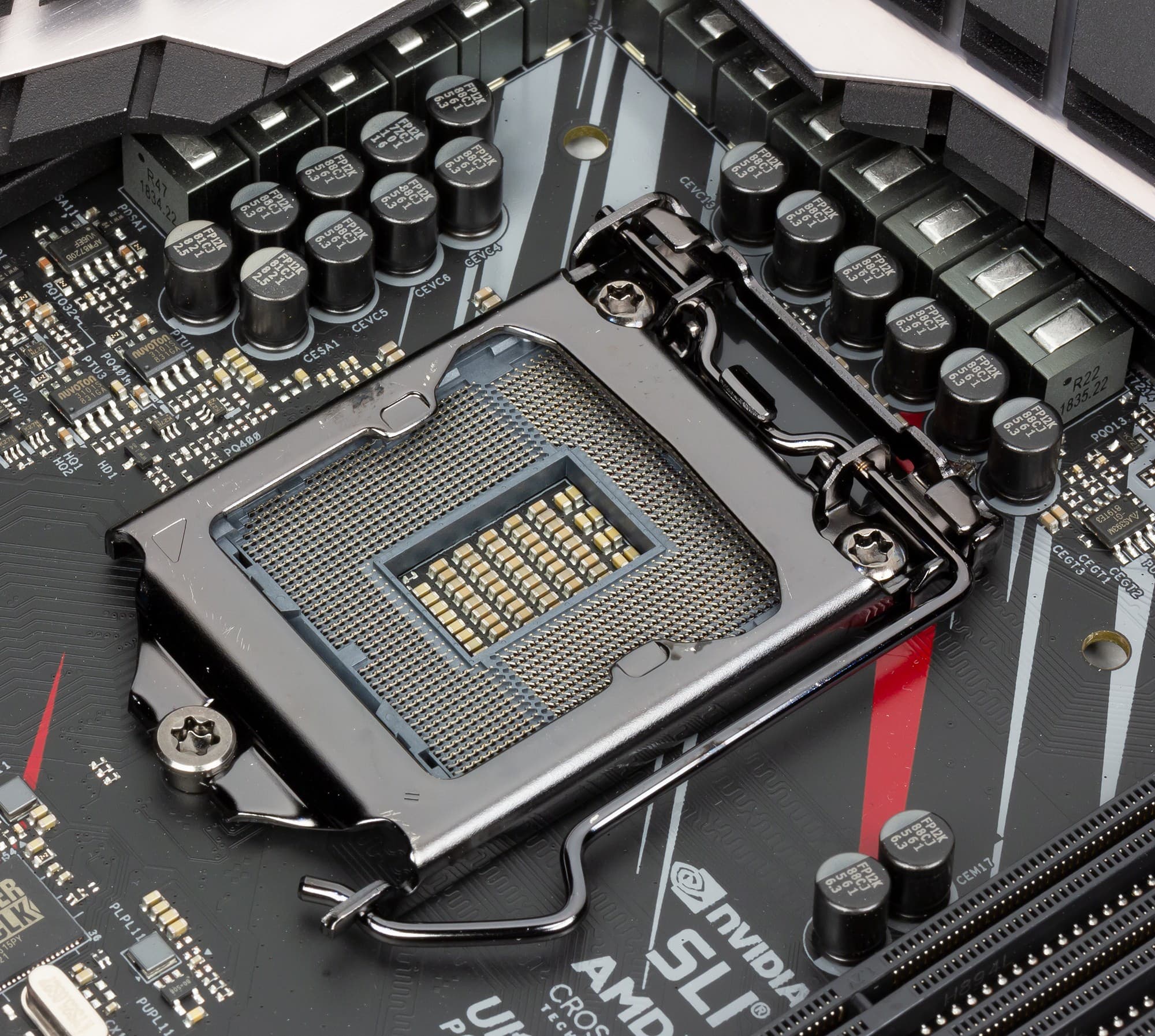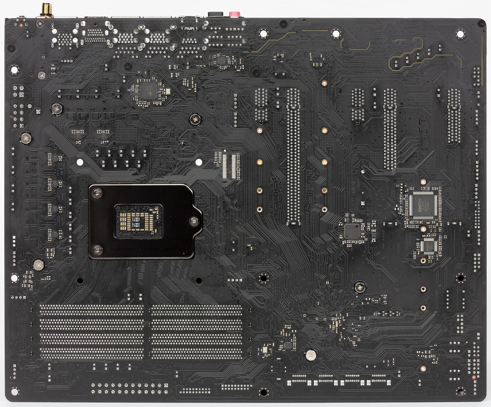 Ну и напоследок про разъемы для подключения вентиляторов, их на плате 8 штук. CPU_Fan1 предназначен для обычного воздушного кулера процессора, а CPU_Fan2 — для подключения жидкостной системы охлаждения процессора. CHA_Fan1—6 поддерживают любые системы охлаждения корпуса, включая также и жидкостные (например, на видеокарте). Мониторинг этих разъемов, а также работу порта PS/2 обеспечивает I/O-контроллер Nuvoton, расположенный на обороте платы.