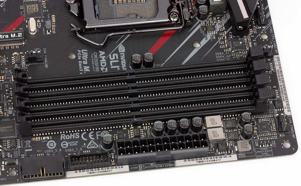 Для установки модулей памяти на плате имеется четыре DIMM-слота (для работы памяти в Dual Channel в случае использования всего 2 модулей их следует устанавливать в А1 и B1 (А2 и В2)). Плата поддерживает небуферизованную память DDR4 (non-EСС), а максимальный объем памяти составляет 64 ГБ (при использовании модулей емкостью по 16 ГБ). Уже появились модули UDIMM на 32 ГБ, и в принципе, никто не мешает ими набрать 128 ГБ ОЗУ. Но при этом стоимость одного такого модуля DIMM превышает цену самой материнки (на момент написания материала).