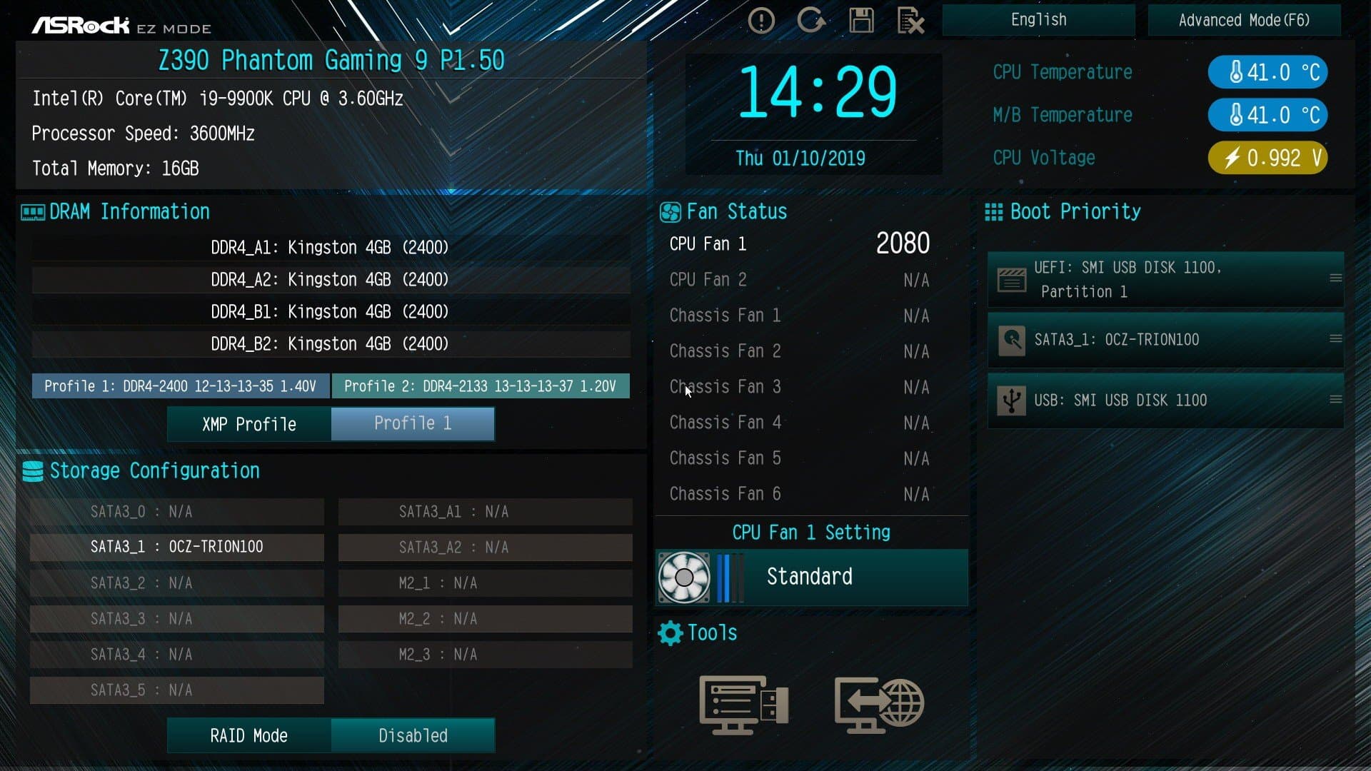 Начальная картинка дает традиционные общие сведения о ПК. Это так называемый простой режим, в который попадают пользователи, ничего не понимающие в тонкостях настройки работы процессора, памяти и пр. Здесь можно выбрать язык интерфейса, поменять дату, время, настроить работу запитанных через материнскую плату вентиляторов/кулеров, выбрать загрузочный диск, выполнить проверку наличия новой версии BIOS и установить ее.