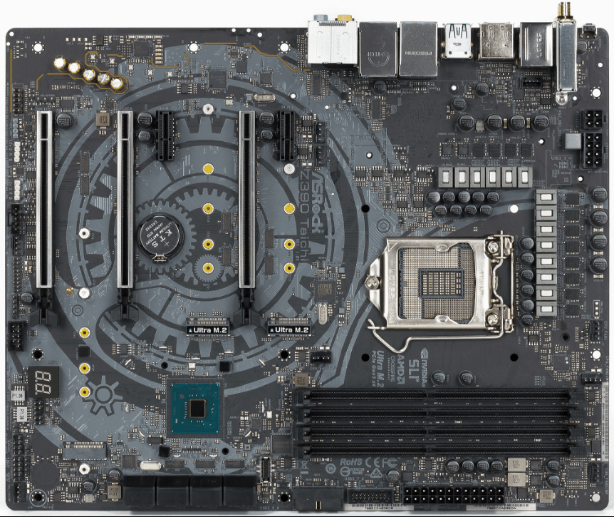 Сразу бросилось в глаза, что дизайн ну о-о-очень напоминает... Taichi. А ну-ка, сравним Z390 Phantom Gaming 9 и Z390 Taichi в виде GIF-файлов (для просмотра надо кликнуть на картинке). Лицевая сторона: