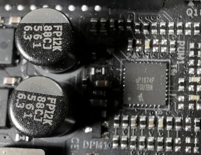 Питание модулей памяти имеет 2-фазную схему, управляется контроллером uP1674 (uPI Semiconductor).