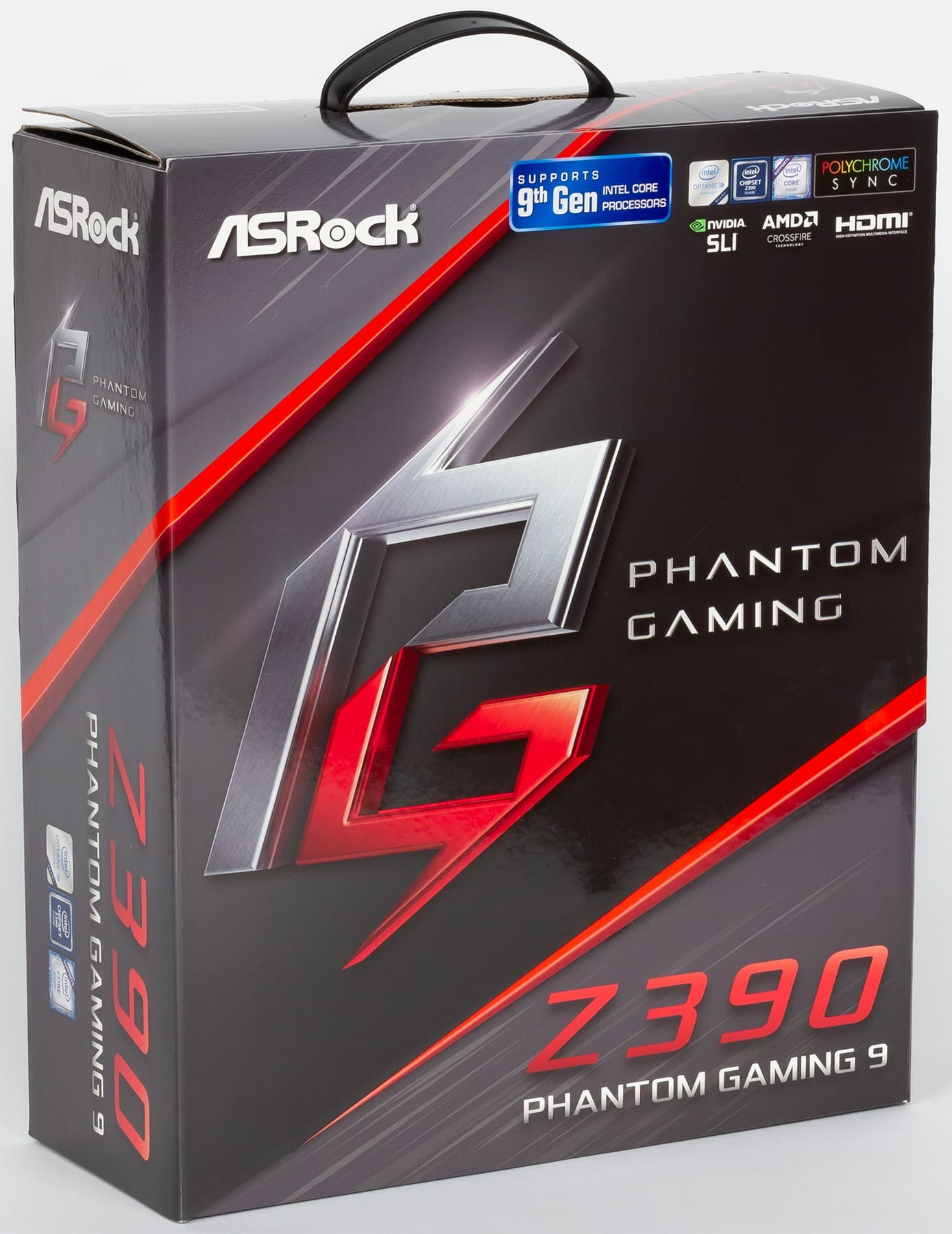Плата поставляется в большой коробке с ручкой для переноски, облаченной в глянцевую суперобложку, выполненную в серо-красных тонах, с упоминанием поддержки основных (по мнению производителя) технологий, приоритетных для игроков: Nvidia SLI, AMD CrossFire, 9-го поколения процессоров Intel Core.