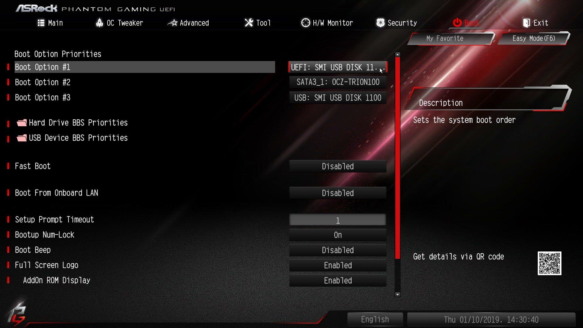 Пункт меню Boot дает нам обычный выбор накопителя и иные параметры загрузки.