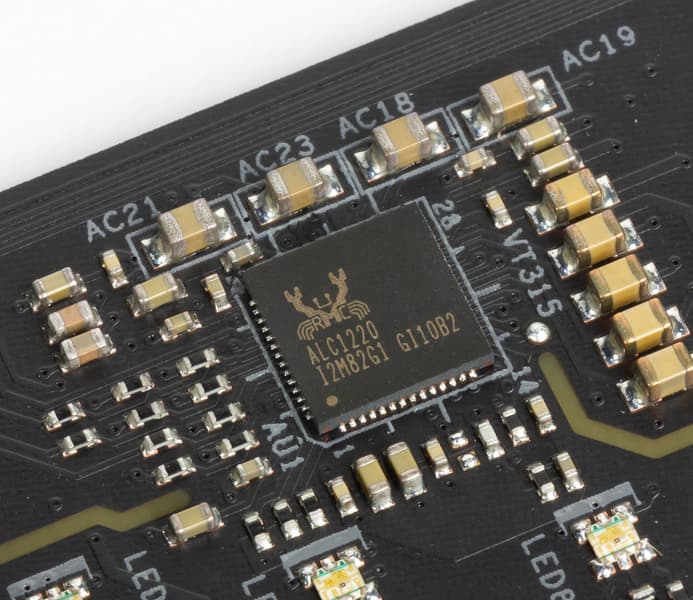 Как и практически во всех современных материнских платах, звуком заведует аудиокодек Realtek ALC1220. Он обеспечивает вывод звука по схемам до 7.1.