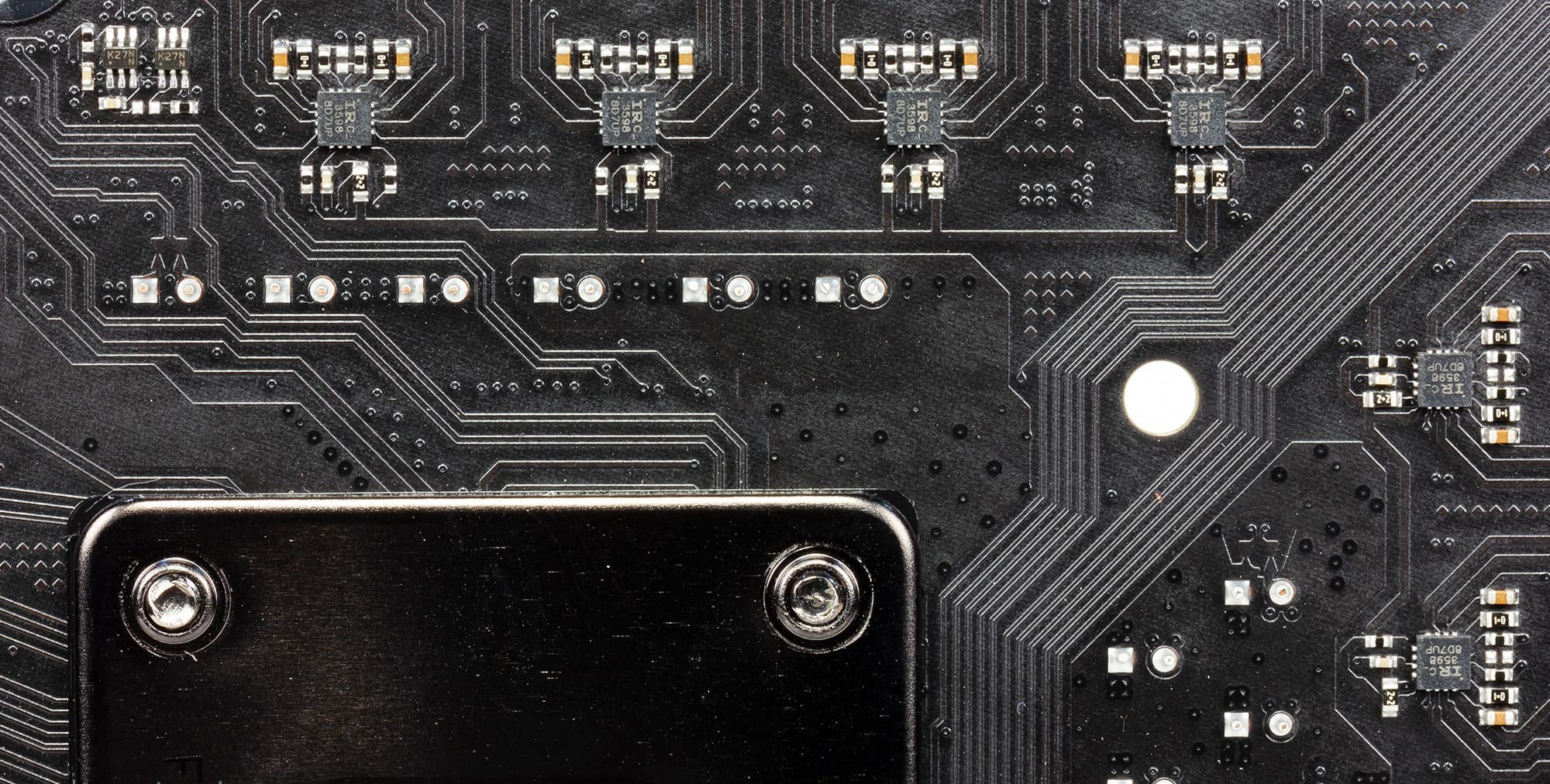 Поэтому инженеры решили использовать 2 фазы для iGPU как есть, а также применить 5 удвоителей фаз IR3598, установив их на обороте печатной платы. Суммарно они и обеспечивают 10 каналов для Vcore. Шестая микросхема IR3598 сконфигурирована как драйвер для GPU Voltage, поэтому на деле ШИМ-контроллер работает в режиме 5+2 фазы. За остальные два канала VCCIO и VCCSA отвечает контроллер Richtek RT8120. Использованы полевые транзисторы TI и Sinopower.
