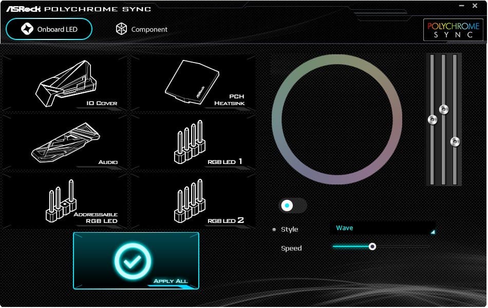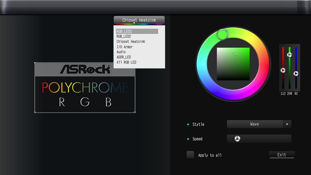 Утилита задает режимы работы элементов подсветки раздельно: кожухи над блоком разъемов задней панели и над аудиотрактом, светодиоды под чипсетным радиатором, а также подключенные к трем RGB-разъемам элементы моддинга (ленты, вентиляторы и др). Можно задать для всех элементов единый режим свечения.