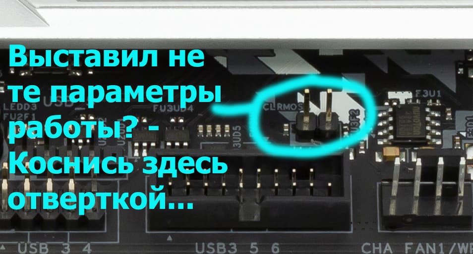 Понятно, что кнопок питания и перезагрузки на материнке нет (эта привилегия относится только к топовому сегменту). А вот способ очистки CMOS, чтобы вернуть компьютер «с небес на землю» — имеется в виде перемычки.