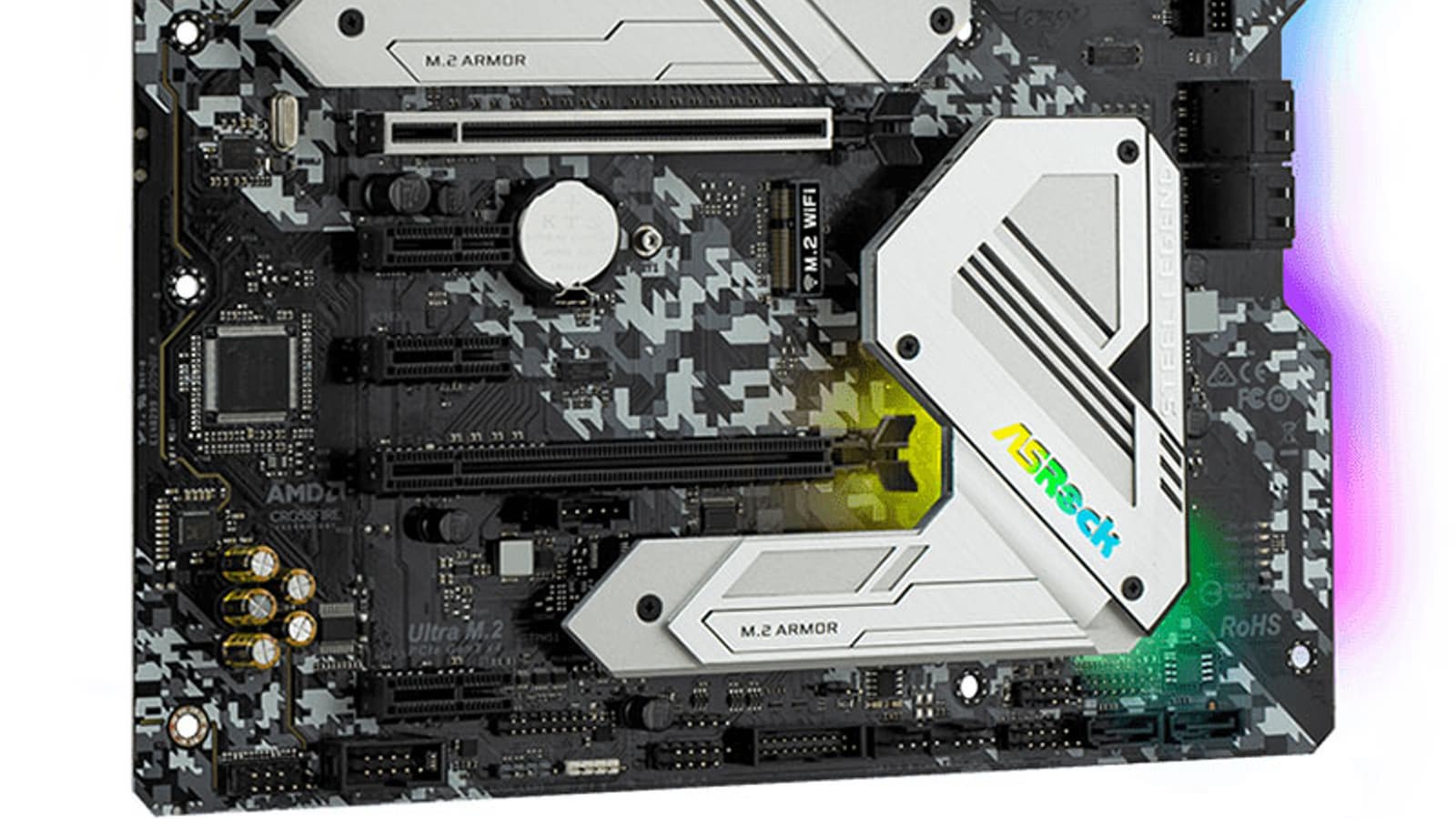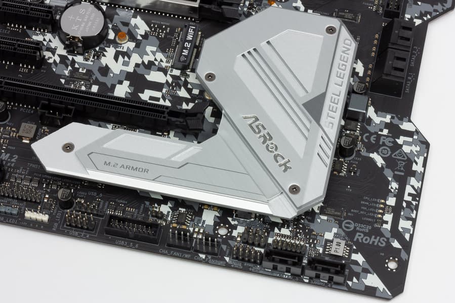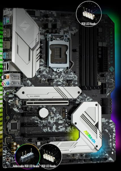 Обычно бывает: чем ниже уровнем материнская плата, тем скромнее подсветка. У топовых материнок мы привыкли видеть переливы светодиодов, рассыпанных по радиаторам, кожухам и даже оборотным сторонам PCB. Удивительно, что серия Steel Legend все же продолжает такую традицию. Пусть и без подсветки основного радиатора VRM.