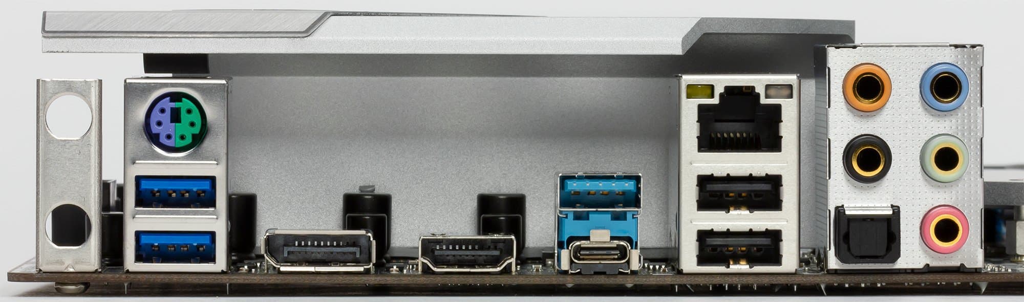 | Разъемы на задней панели | 1 × USB 3.1 Gen2 (Type-C) 1 × USB 3.1 Gen2 (Type-A, голубой) 2 × USB 3.1 Gen1 (Type-A, синие) 2 × USB 2.0 (Type-A, черные) 1 × RJ-45 1 × PS/2 5 аудиоразъемов типа миниджек 1 × S/PDIF (оптический, выход) 1 × HDMI 1.4 1 × DisplayPort 1.2 |