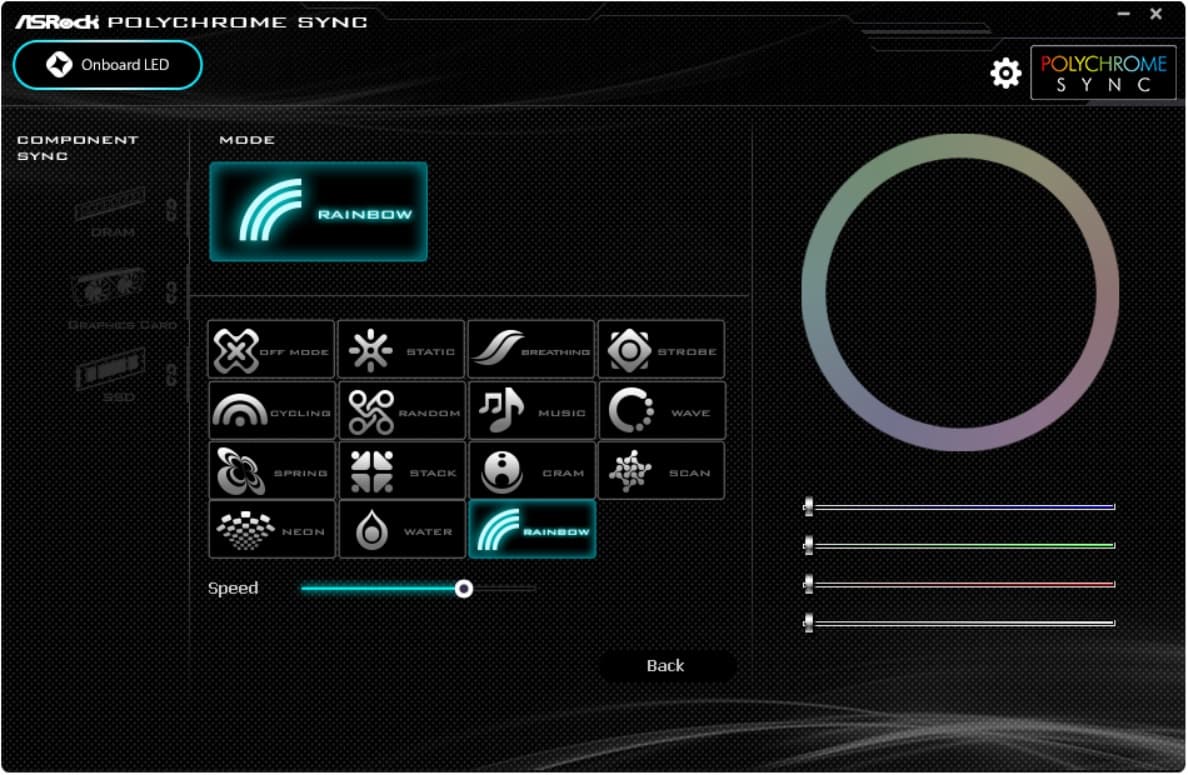 Программа определяет наличие поддерживаемых элементов (включая, например, модули памяти, накопители с RGB-подсветками и т. д. сторонних производителей, у которых есть договоренности с ASRock). Имеется неплохой набор световых эффектов, также можно раздельно назначать эффекты на подсветку под радиатором, боковую сторону платы и порты RGB/ARGB.