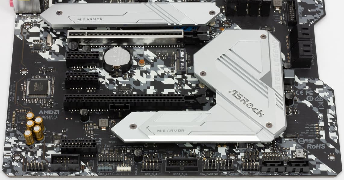 Оба слота M.2 имеют радиаторы с термоинтефейсом, и это очень необычно для относительно бюджетной материнской платы.