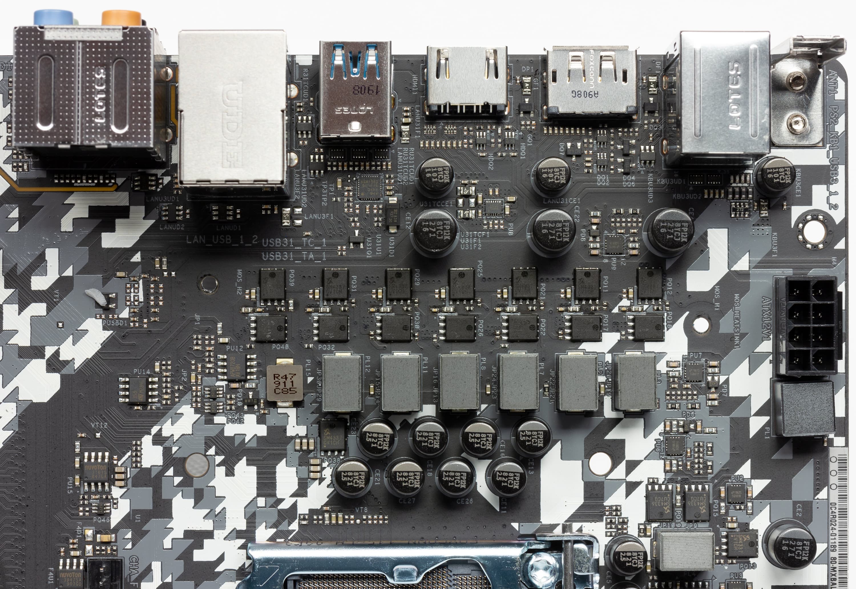 Интересно отметить, что обычно над набором гнезд на задней панели ставят пластиковые кожухи, но в данном случае роль кожуха сыграл радиатор VRM, и это придало материнке реально особую эстетику.