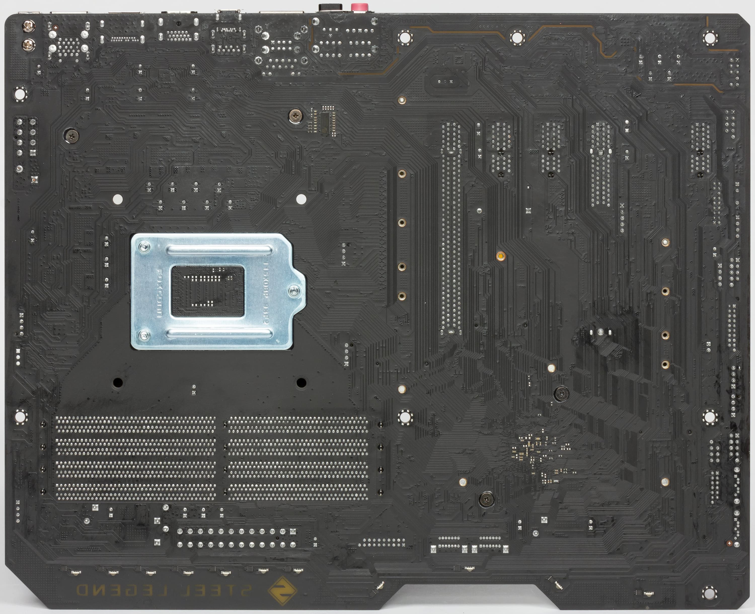На оборотной стороне мало элементов, там размещена мелкая логика. Обработан текстолит хорошо: во всех точках пайки острые концы срезаны. Понятно, что плата не топового уровня ничего дополнительного (типа защитной пластины) иметь и не должна. Кстати, несмотря на то, что крепежных отверстий — 8, все же имеется некоторый перекос: целых 4 отверстия по левой (на снимке — верхней) кромке, когда как на правой (на снимке — нижней) кромке всего одно. Да, сделаны некоторые вырезы в текстолите в местах обычных крепежных отверстий, из-за чего те потеряли смысл. В этих местах на обороте нет никаких контактов, и поэтому плата может свободно опираться на латунные вставки (обычная принадлежность в корпусах для крепления материнок) либо на выпрессованные возвышенности (что также встречается в современных корпусах). Однако именно опираться, но не закрепляться. То есть целый край платы свободно лежит на втулках, как раз в том месте, где слоты для модулей памяти, а самое главное — где 24-контактный разъем питания АТХ, а мы знаем с каким подчас усилием требуется вытащить этот «хвост» из гнезда на плате. И уж тут никак не обойтись без того, чтобы удерживать плату руками. Считаю, что не зачем было «выпендриваться» и срезать верхний край текстолита, следовало бы его оставить с крепежным отверстием.