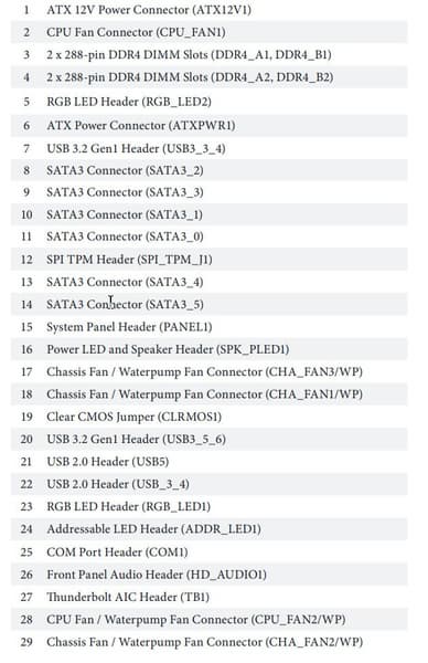 | Прочие внутренние разъемы | 24-контактный разъем питания ATX 8-контактный разъем питания EPS12V 1 слот M.2 (E-key)для адаптеров беспроводных сетей 2 разъема для подключения 4 портов USB 3.1 Gen1 2 разъема для подключения 3 портов USB 2.0 5 разъемов для подключения 4-контактных вентиляторов 1 разъем Thunderbolt AIC 1 разъем для подключения адресуемой RGB-ленты 2 разъема для подключения неадресуемой RGB-ленты 2 группы разъемов для подключения передней панели корпуса 1 разъем TPM (Trusted Platform Module) 1 разъем COM-порта |