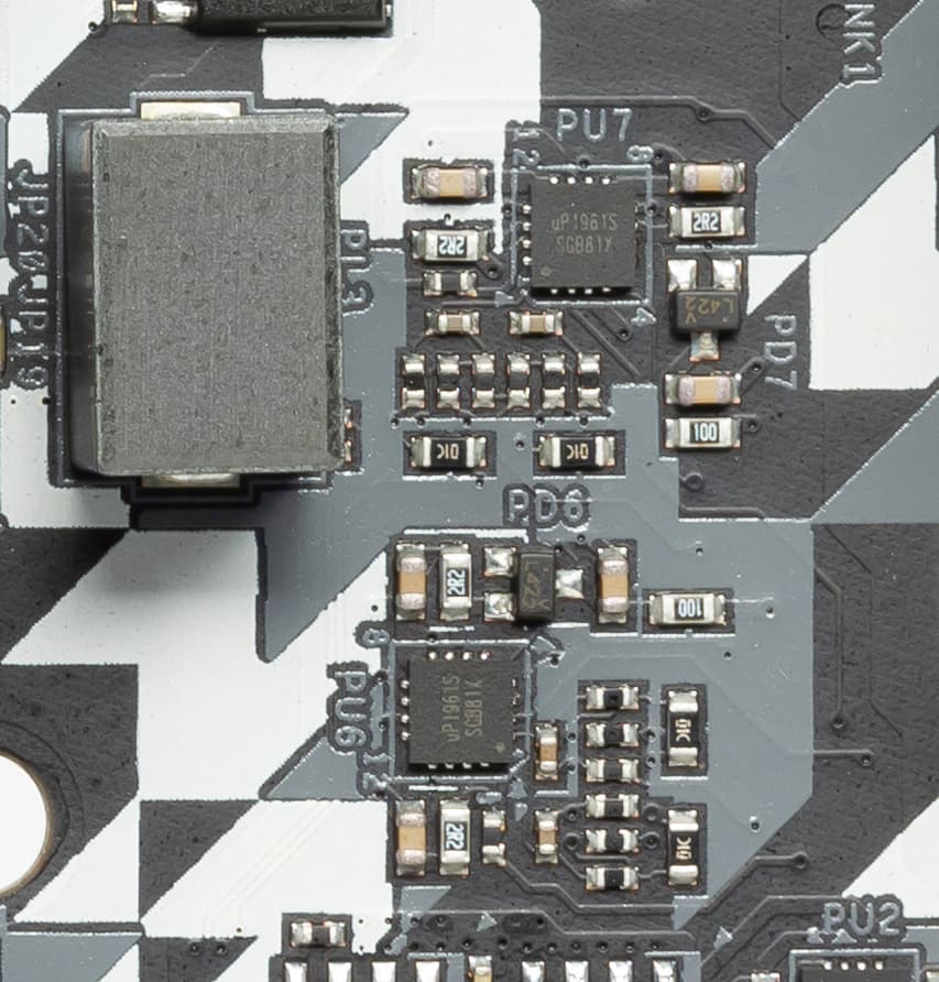 Однако этот ШИМ-контроллер не рассчитан на 8 фаз. И мы видим уже привычную хитрость по образованию псевдофаз: всего драйверов uP1961S — пять.