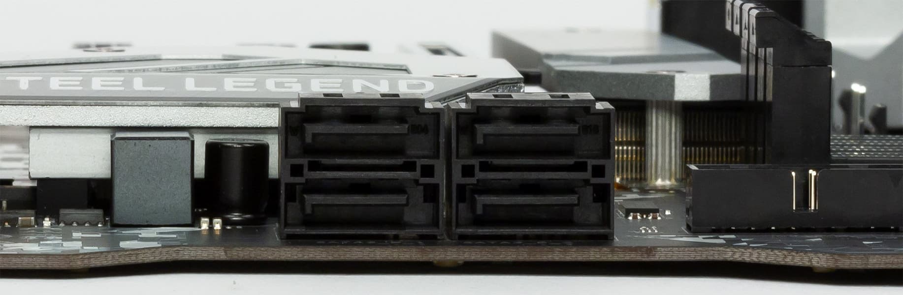 Все 6 портов SATA600 реализованы через чипсет Z390. Вероятно для удобства размещения кабелей порты SATA разделены на 2 группы: 4 порта расположены горизонтально и находятся с правой стороны около выреза в текстолите, и еще 2 порта (вертикальная ориентация) — внизу платы.