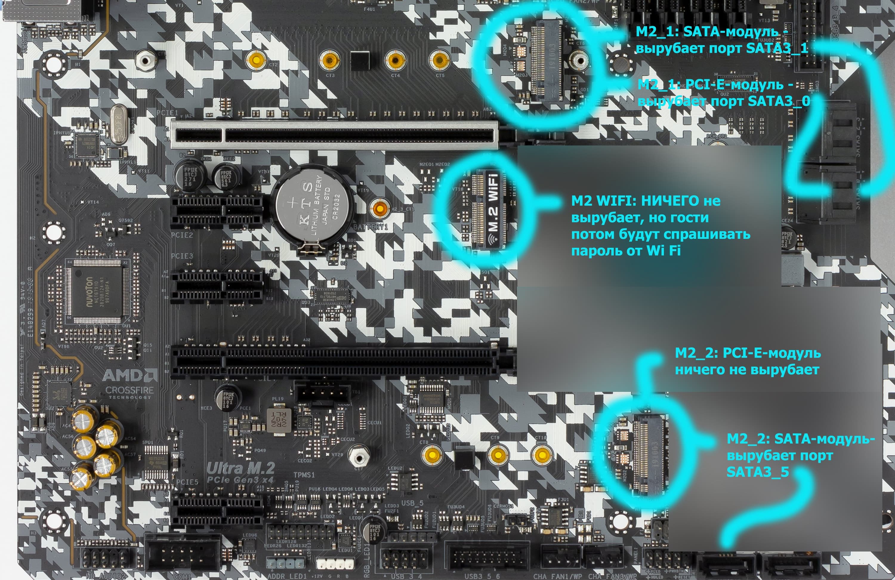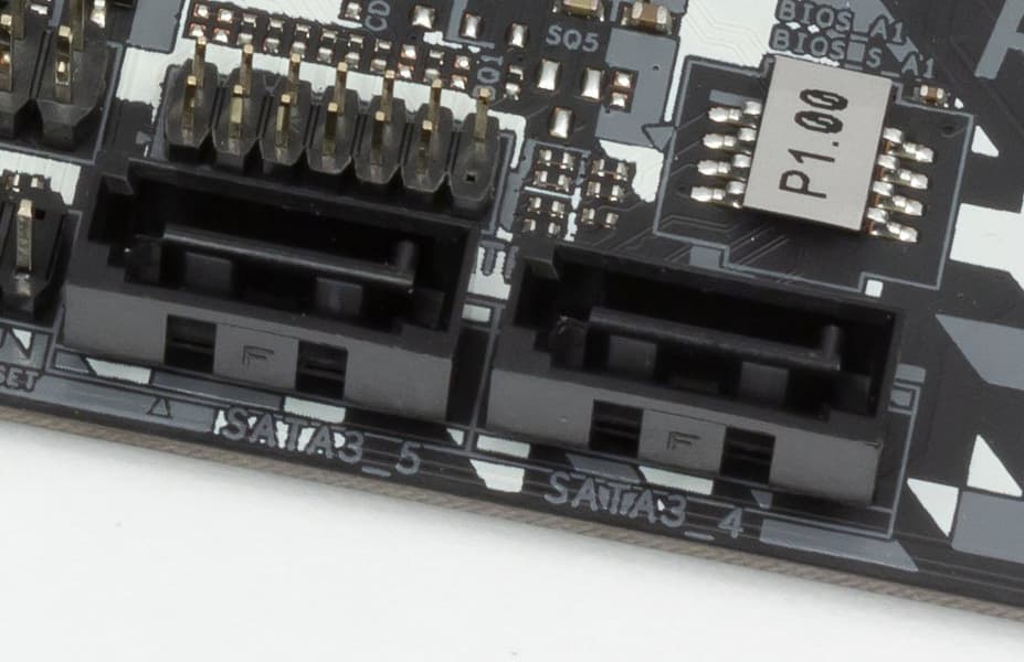 Портов ввода-вывода у чипсета на всех не хватает, поэтому традиционно приходится делить аппаратные ресурсы между устройствами. У данной платы слот M2_1 (верхний) в случае использования накопителя SATA делит линии с портом SATA3_1 (а если используется накопитель PCI-E, то — SATA3_0). Слот М2_2 делит линии только в одном случае: если используем накопитель PCI-E, то все SATA полноценно доступны, а если используем накопитель M.2 SATA, то вырубится SATA3_5.. То есть читатели поняли, что, например, если мы подключили жесткий диск или SSD к порту SATA3_5, то в М2_2 слот вставлять накопители с интерфейсом SATA бесполезно. Или если заняли слот M.2_1 модулем с интерфейсом PCI-E, то порт SATA3_0 будет банально отключен.