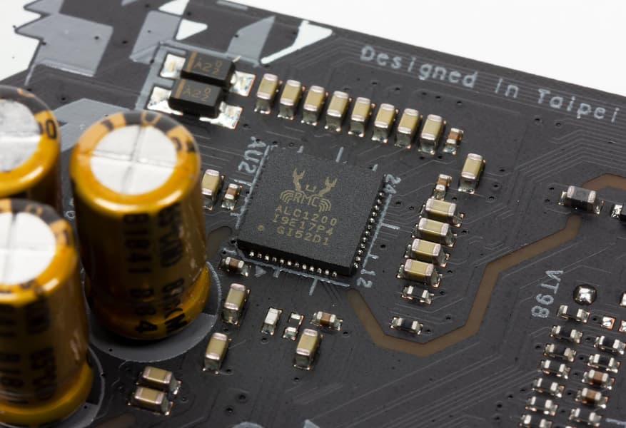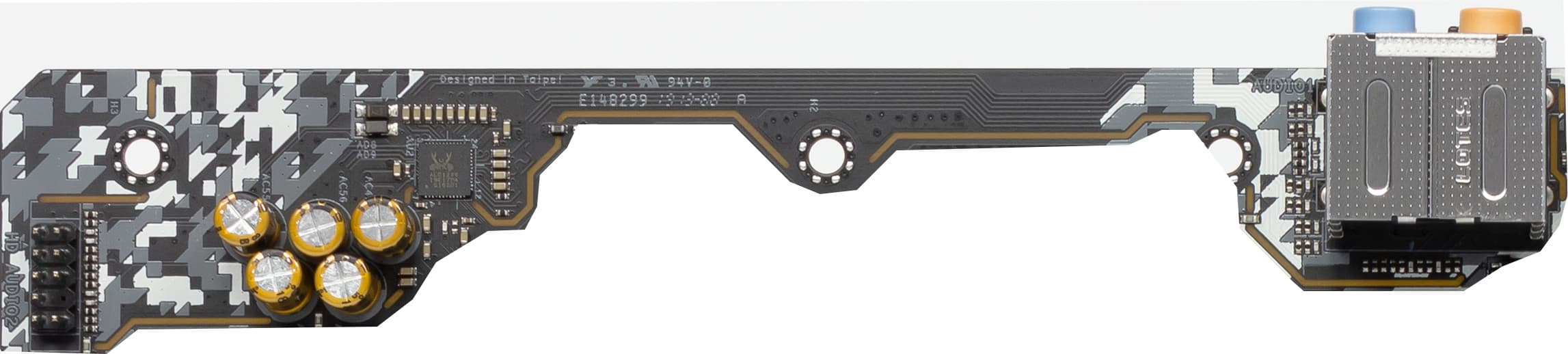 Аудиотракт вынесен на угловую часть платы, не пересекается с другими элементами, левый и правый каналы разведены по разным слоям печатной платы. Все аудиоразъемы имеют позолоченное покрытие (маркетинговый ход для такого рода плат), при этом сохранена привычная цветовая окраска разъемов (которая неплохо помогает подключать нужные штекеры без вглядывания в их наименование).