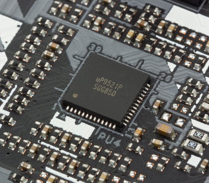 А это уже намекает на схему 3+2. И действительно установлены удвоители uP9561S, которые превращают реальные 3 фазы в 6. Короче, каждые 2 фазы работают зеркально, поэтому реально схема — 3+2.