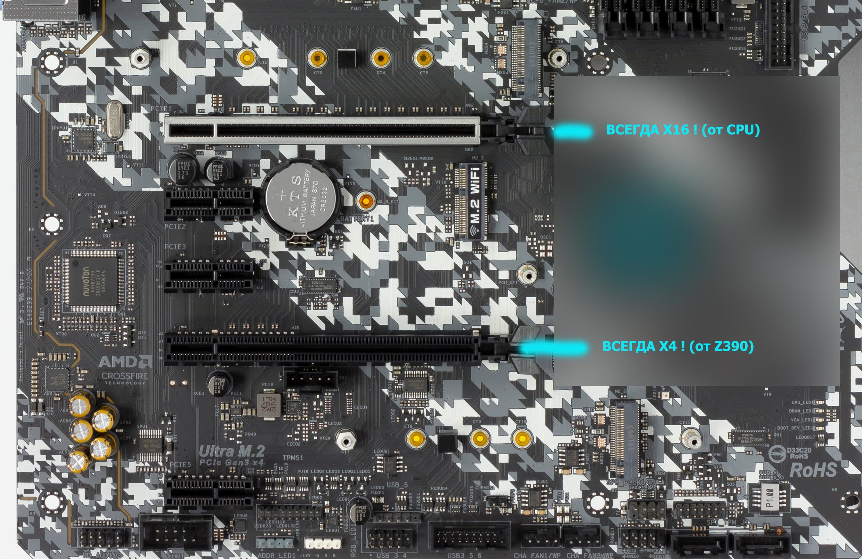 У процессора есть 16 линий PCI-E 3.0, они идут только на первый слот PCI-E x16, второй «длинный» слот всегда получает х4 от чипсета Z390. Вот так выглядит схема распределения: