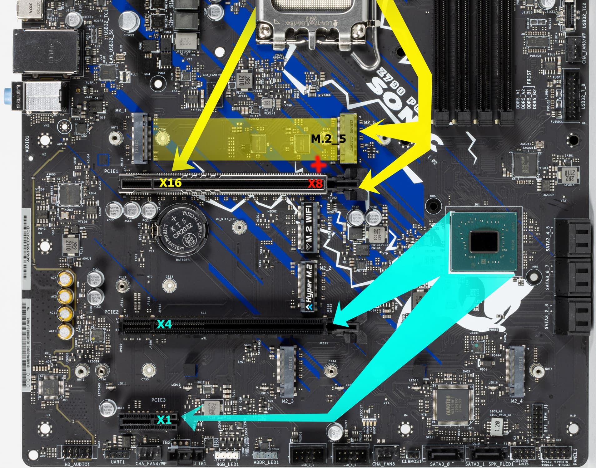 Теперь посмотрим выше на то, как работают процессоры в данной конфигурации. У CPU 13/12-го поколений всего 20 линий PCIe, 4 из них версии PCIe 4.0 отведены на порт М.2 (M.2_2). Оставшиеся 16 линий PCIe 5.0 надо делить на слот PCIe x16_1 и слот M.2 (M.2_5). Вариантов переключения несколько: