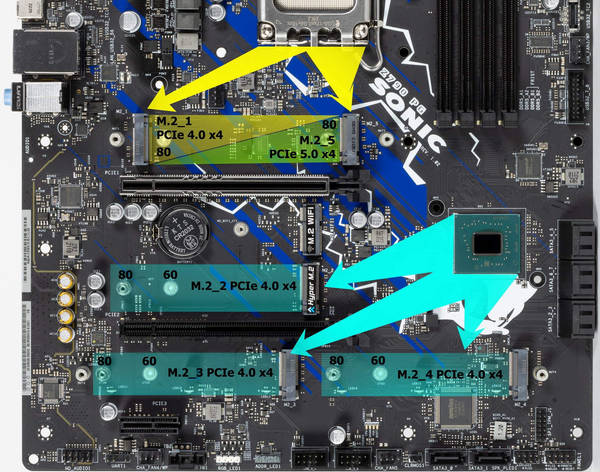 Второй, третий и четвертый слоты M.2 получают данные от чипсета Z790, а M.2_1/2_5 — от CPU, при этом M.2_5 получает PCIe 5.0, деля ресурсы со слотом PCIe x16_1 (о чем я уже выше рассказывал), а M.2_1 штатно получает от процессора PCIe 4.0.