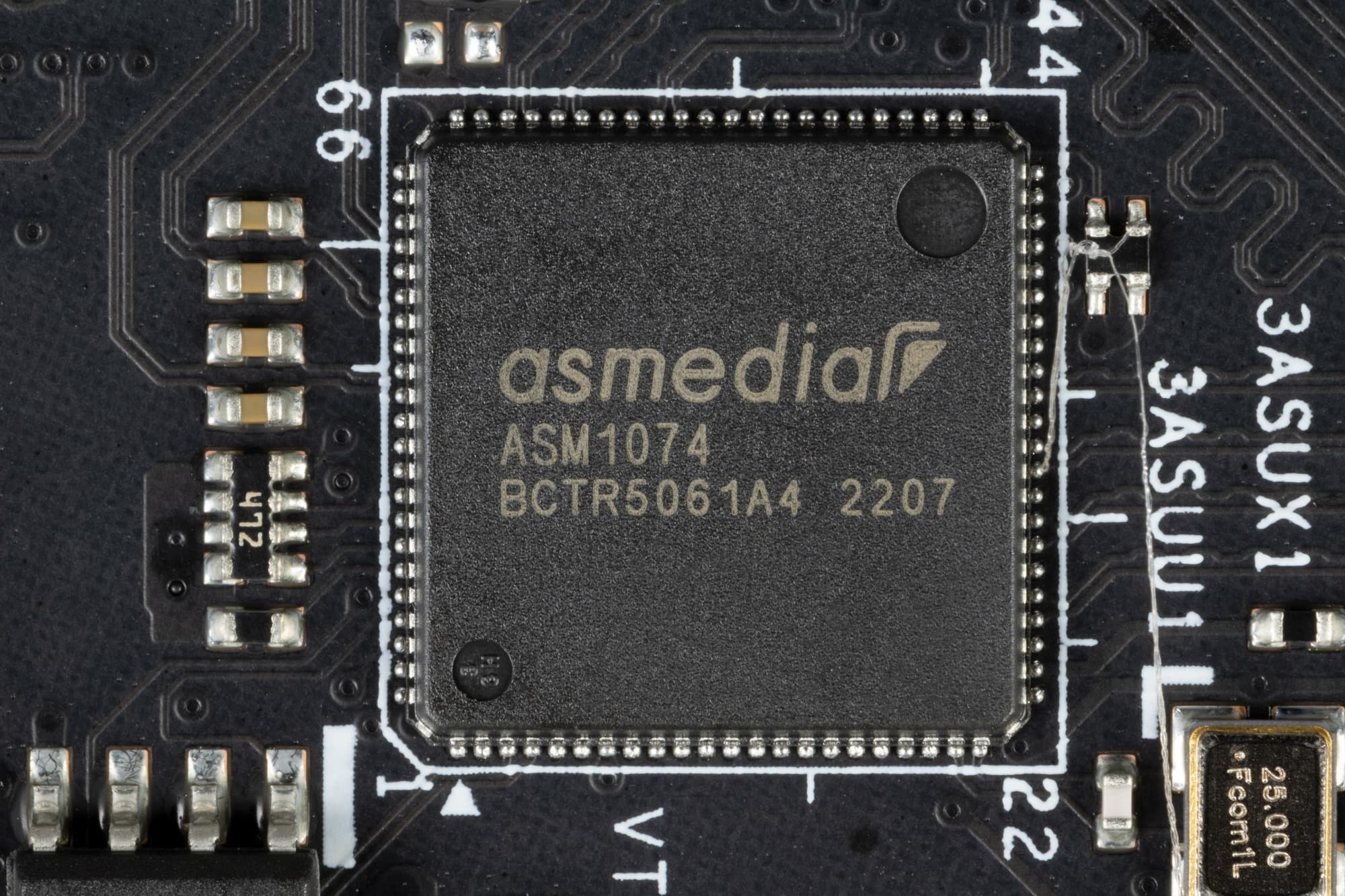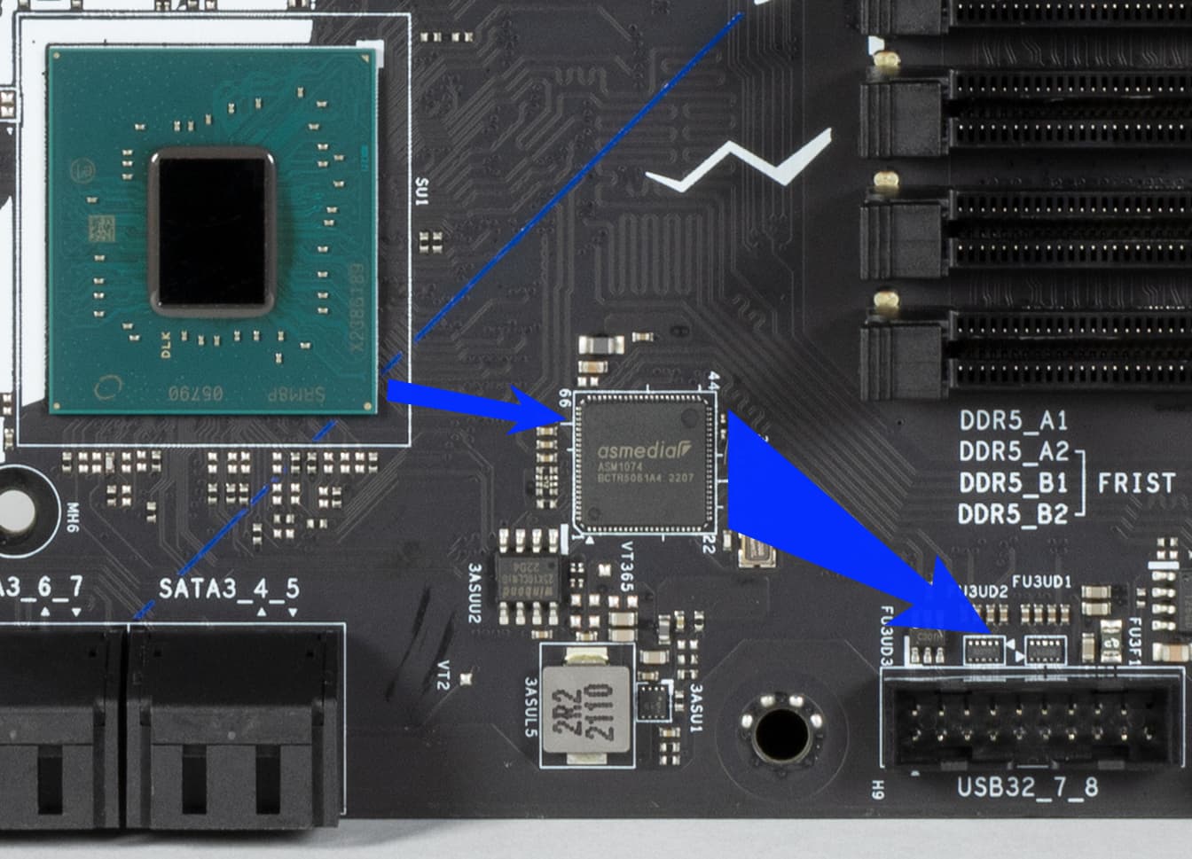 - 7 портов USB 3.2 Gen1: 2 реализованы через контроллер ASMedia ASM1074 (на него потрачена 1 линия USB 2.0 от Z790) и представлены внутренним разъемом на материнской плате на 2 порта ; еще 3 реализованы через Z790 и представлены на задней панели двумя портами Type-A (синего цвета) и одним портом Type-C; оставшиеся 2 порта реализованы через контроллер ASMedia ASM3042 (на него потрачена 1 линия PCIe от Z790) и представлены на задней панели портами Type-A (желтого цвета);