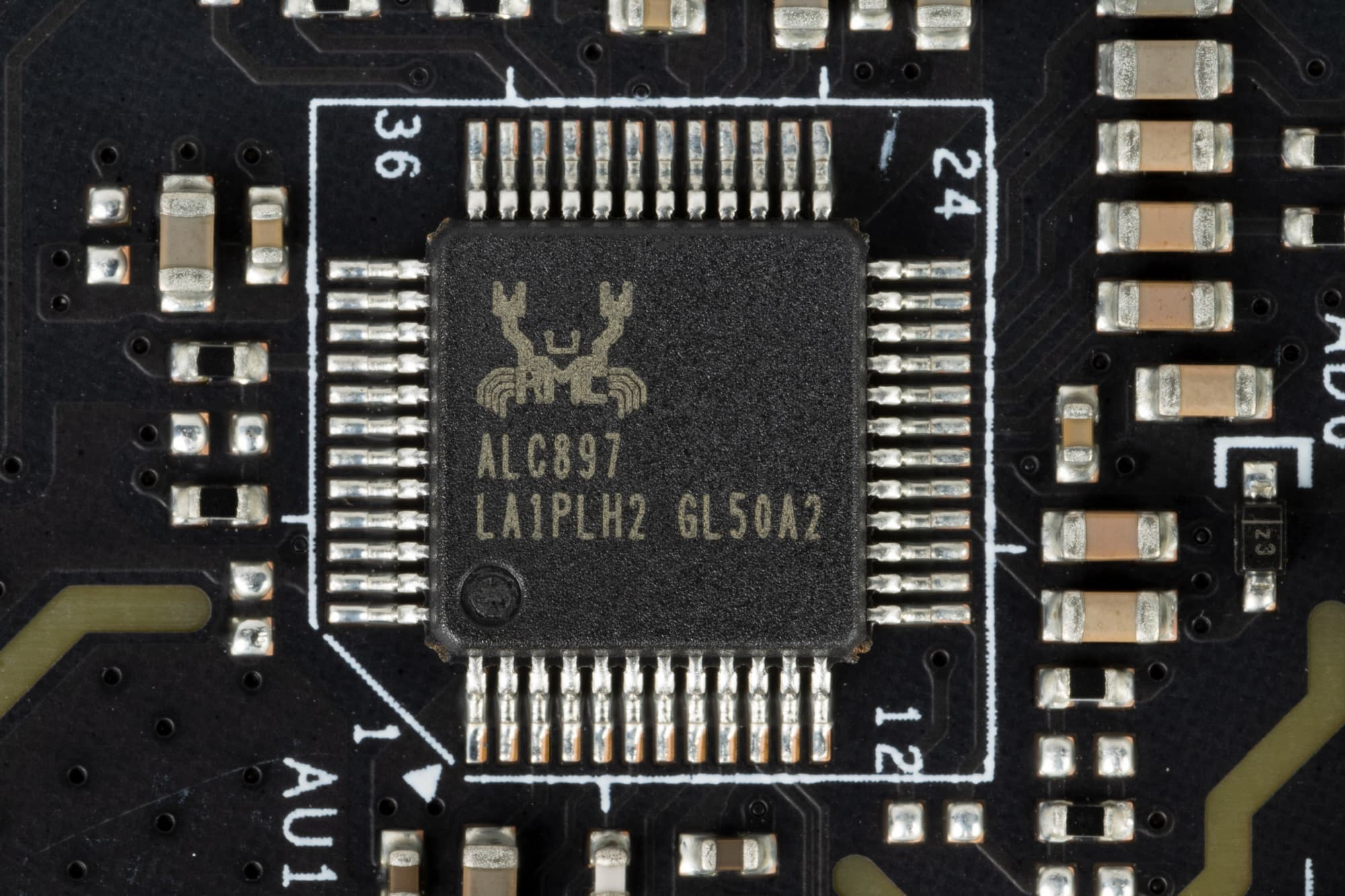 Для относительно простой материнской платы производитель выбрал уже весьма старый и простенький кодек Realtek ALC897. Он в целом обеспечивает вывод звука по схемам до 7.1 с разрешением до 24 бит / 192 кГц (в данном случае вывод упрощен до 5.1, даже нет вывода через S/PDIF).