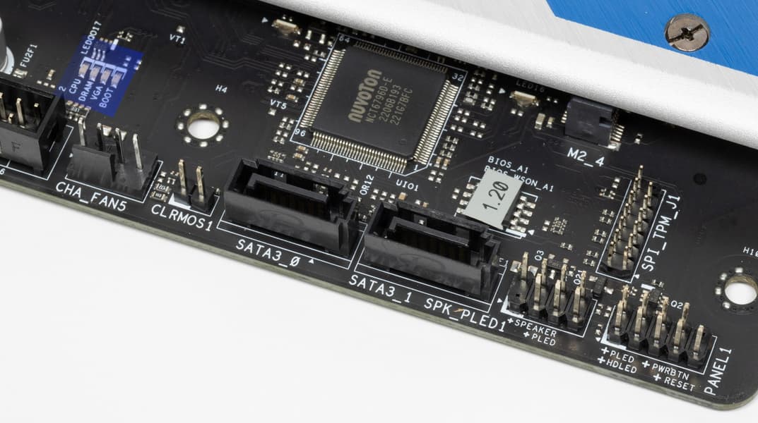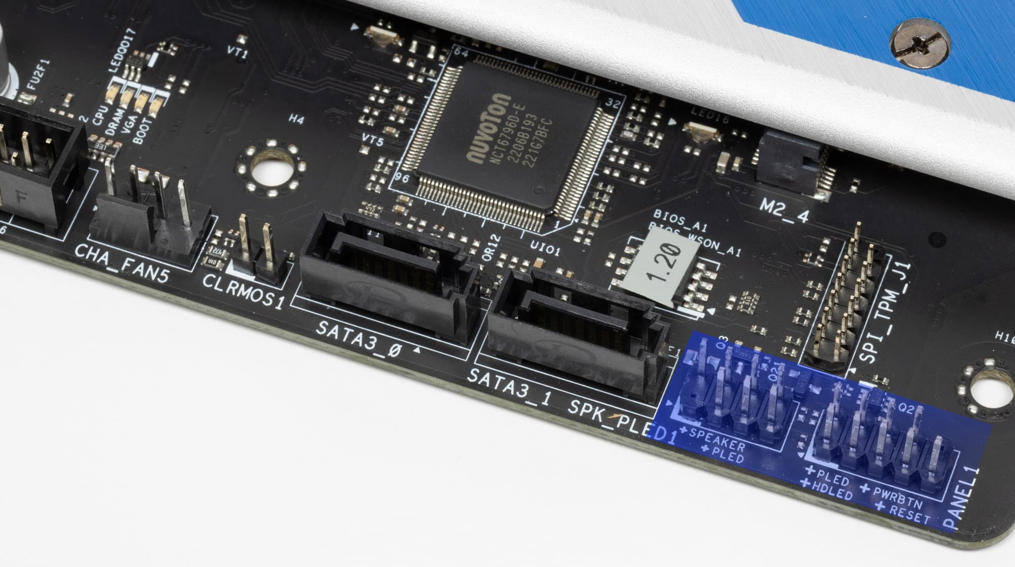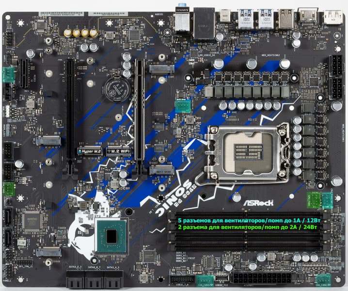 А вот что касается SATA, то в арсенале платы аж 8 таких портов! Система питания процессора не самая мощная, но все же способная обеспечить работу любых совместимых процессоров с приличным запасом на разгон. А вот сетевые возможности скромные: всего один проводной контроллер 2,5 Гбит/с и пустой слот M.2 (E-Key) для приобретаемого отдельно беспроводного контроллера. В числе плюсов платы можно упомянуть широкие возможности для подключения дополнительных RGB-устройств.