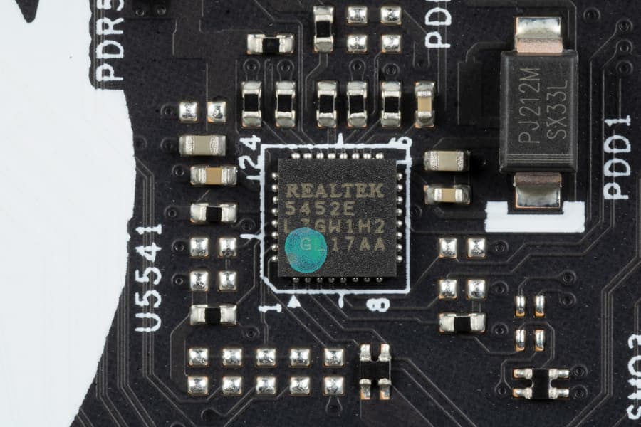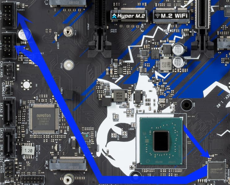 28 линий PCIe оказались занятыми (16 PCIe 4.0 + 4 SATA + 8 PCIe 3.0). Связь с аудиокодеками уровня Realtek RTL408x идет через USB 2.0, а с кодеками уровня RTL1220 и ниже – через HDA (эмуляцию шины PCI), так что в данном случае линия USB 2.0 не расходуется. Но один USB 2.0 расходуется на поддержку слота M.2 (Key E) для беспроводной связи, а также контроллер AMS1074 для своих нужд использует сигнальные линии USB 2.0. Детально об этом ниже в разделе USB-портов.