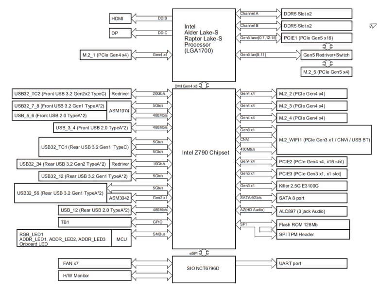 Процессоры Intel Core 13/12-го поколений (совместимые с сокетом LGA1700 и поддерживаемые Z790) имеют 20 линий ввода-вывода (16 PCIe 5.0, 4 PCIe 4.0), не имеют USB и SATA портов. При этом взаимодействие с Z790 идет по особому каналу Digital Media Interface 4.0 (DMI 4.0 x8). Все PCIe линии процессора идут на слоты расширения PCIe и порт М.2. Serial Peripheral Interface (SPI) используется для взаимодействия с системой UEFI/BIOS, а шина Low Pin Count (LPC) — для связи с устройствами ввода/вывода, не требующими высокой пропускной способности (контроллерами вентиляторов, TPM, старой периферии).