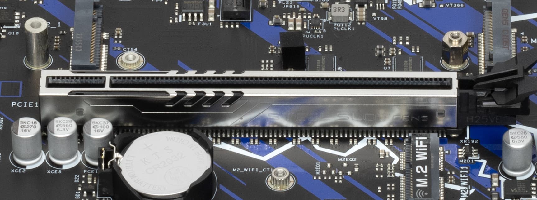 Первый слот PCIe x16 имеет металлическое армирование из нержавеющей стали, которое увеличивает надежность. Кроме того, такая защита предохраняет слот от электромагнитных помех.