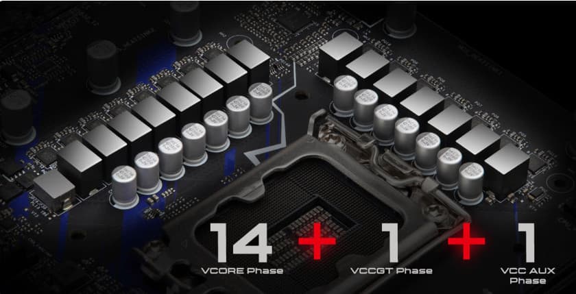 Схема питания процессора выполнена по схеме 14+1+1 (всего 16 фаз, 14 на VCore, 1 на VCCIO и 1 на интегрированное графическое ядро).