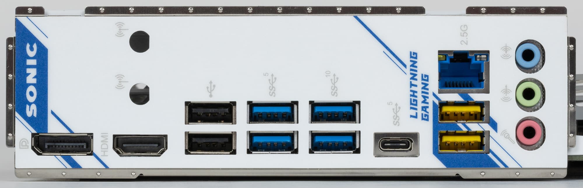 - 2 порта USB 3.2 Gen2: все реализованы через Z790) и представлены на задней панели двумя портами Type-A (голубого цвета);