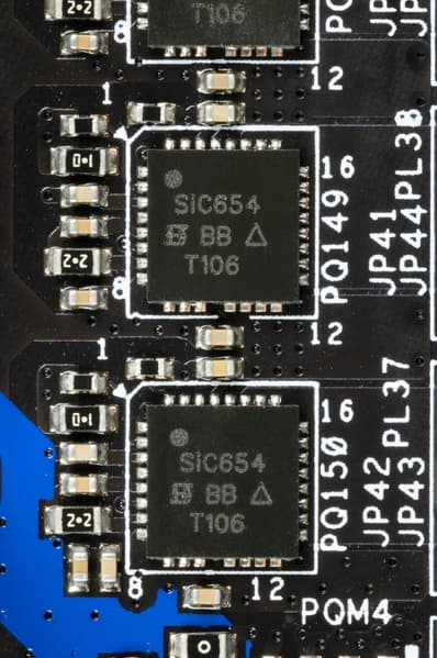 Каждый канал фазы VCore и iGPU имеет суперферритовый дроссель и SiC654 DrMOS от Vishay на 50 А.