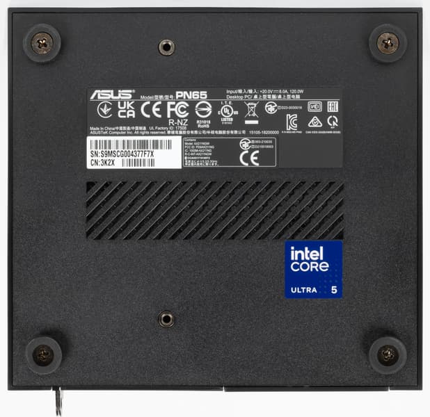 Внешне все ExpertCenter, равно как и очень многие мини-ПК других производителей, выглядят аналогично NUC. Хотя сложно было бы ожидать обратного — для того в свое время унификация и требовалась, чтобы мини-ПК разных компаний стали похожими друг на друга. Фактически ExpertCenter PN65 от «квадратных» NUC отличается лишь немного бо́льшими размерами, причем заметить это невооруженным глазом почти невозможно: стандартный «толстый» (то есть с возможностью установки двухдюймового накопителя) Asus NUC 15 Pro имеет размеры 117×112×54 мм, а здесь 120×130×58 мм, то есть практически одно и то же.