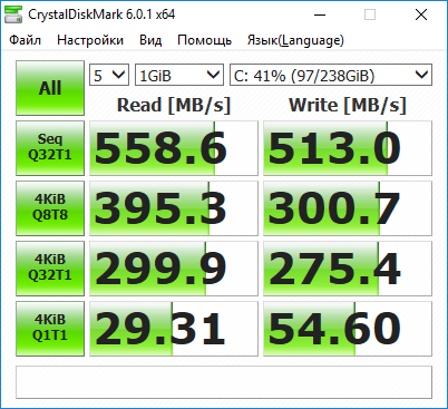 Утилита CrystalDiskMark 6.0.1 демонстрирует аналогичный результат.
