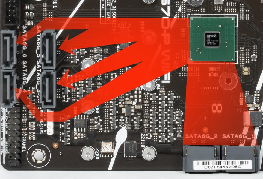 6 портов SATA 1,2,3,4,5,6 реализованы через чипсет X670 и поддерживают создание RAID.