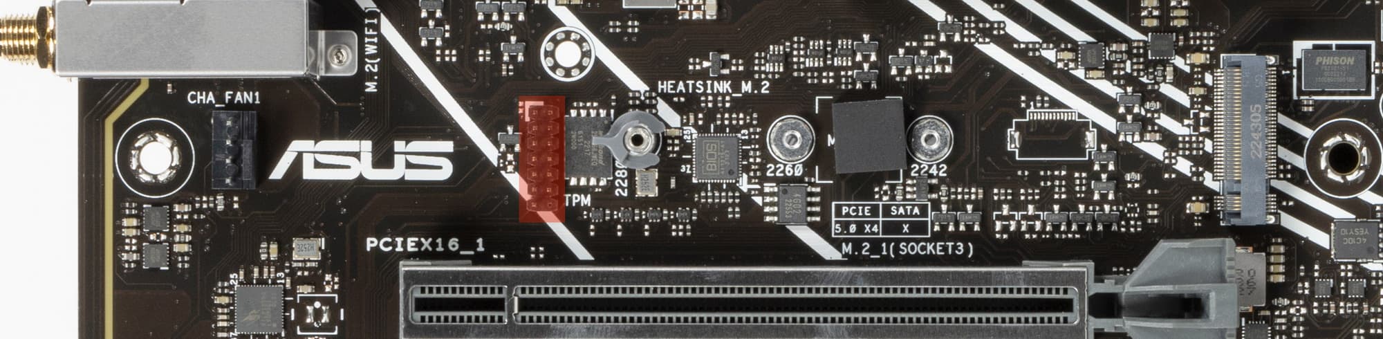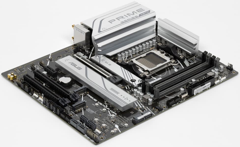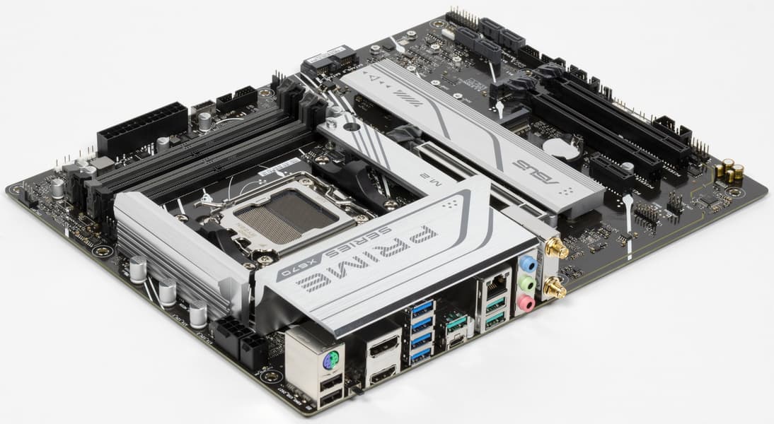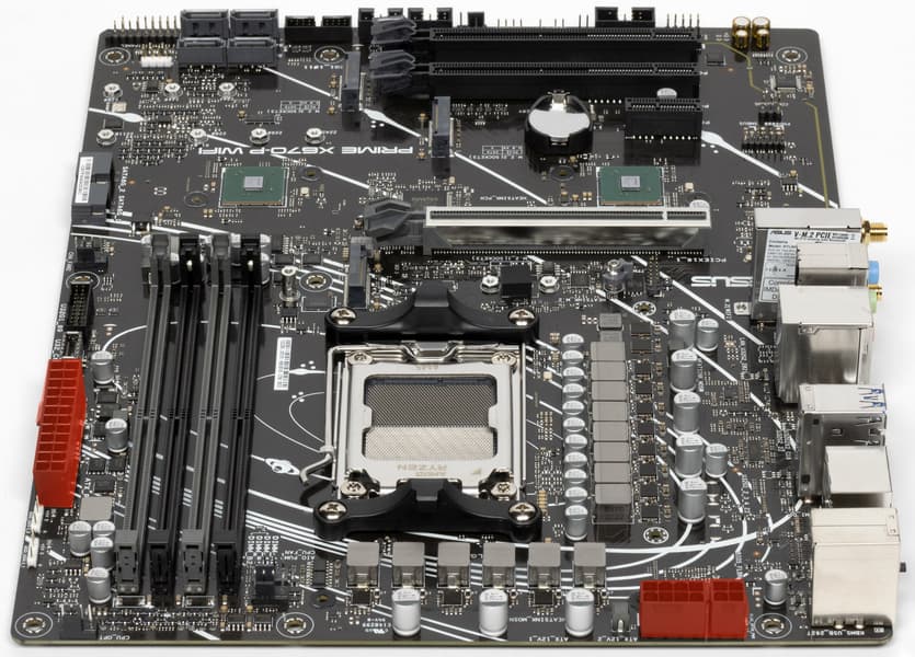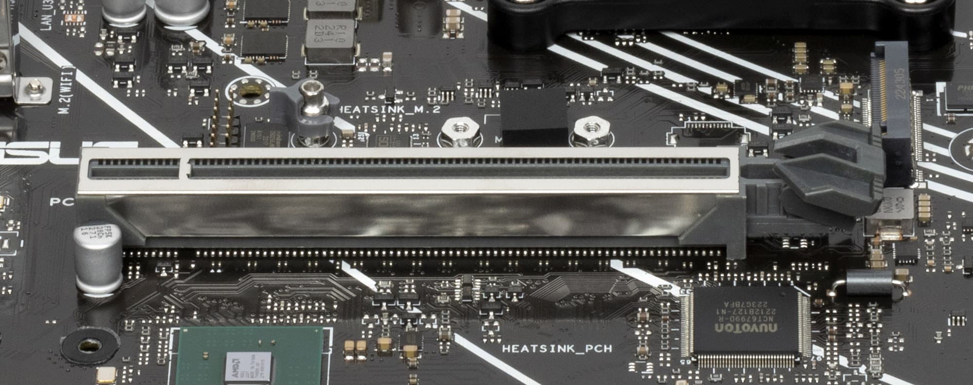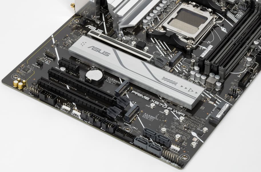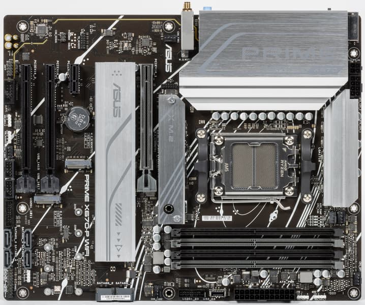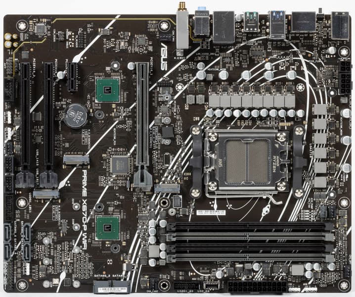 Поддержка периферии у нее неплохая. У Asus Prime X670-P WiFi имеется 19 портов USB разных видов, включая 4 очень быстрых USB 3.2 Gen2, а также USB 3.2 Gen2×2 в виде внутреннего порта Type-C. Плата предлагает слот PCIe х16, который получает от процессора 16 линий PCIe версии 4.0, и еще два «длинных» слота PCIe, но уже PCIe 4.0 x4, плюс один слот PCIe x1 (остальные три слота подключены к чипсету). Также у платы в сумме 3 слота M.2: два из них подключены напрямую к процессору линиями PCIe 5.0 и 4.0, третий подключен к чипсету X670 линиями PCIe 4.0.