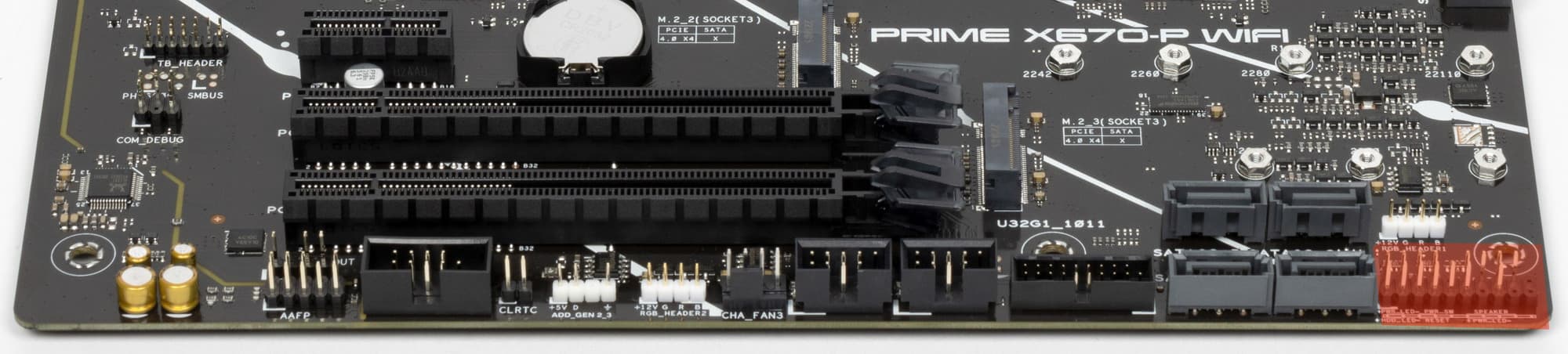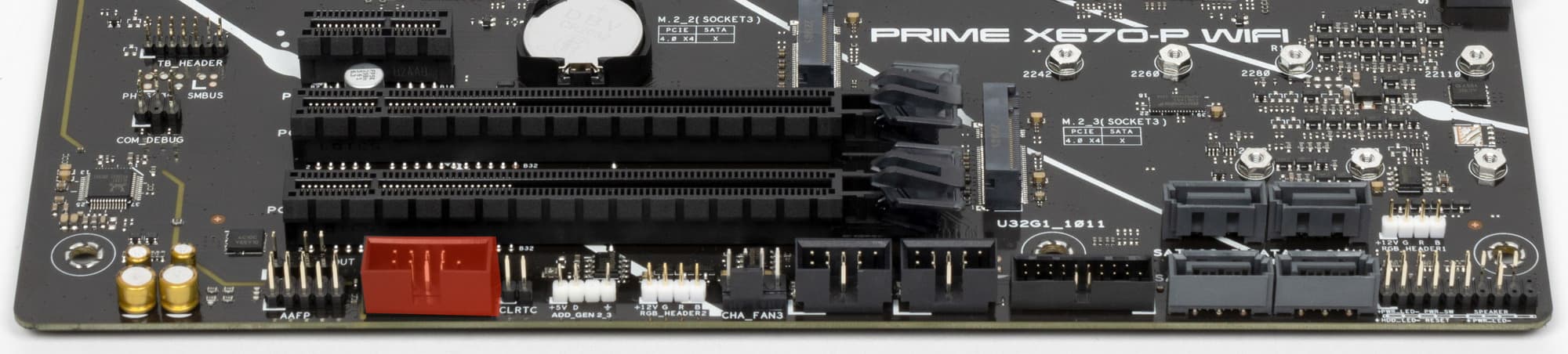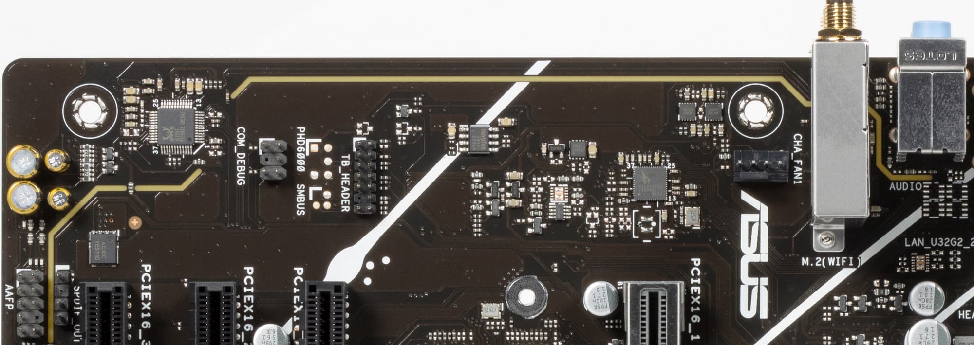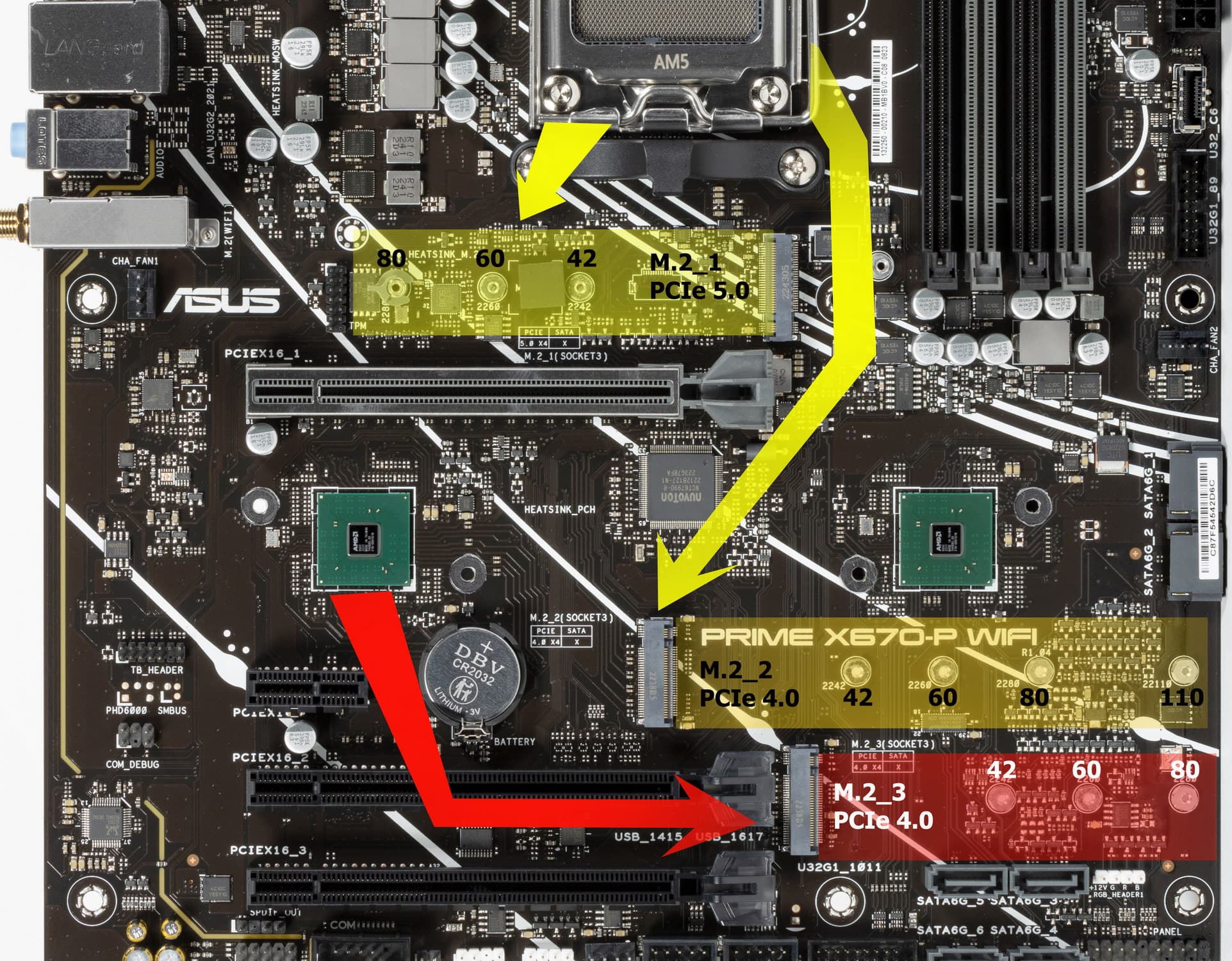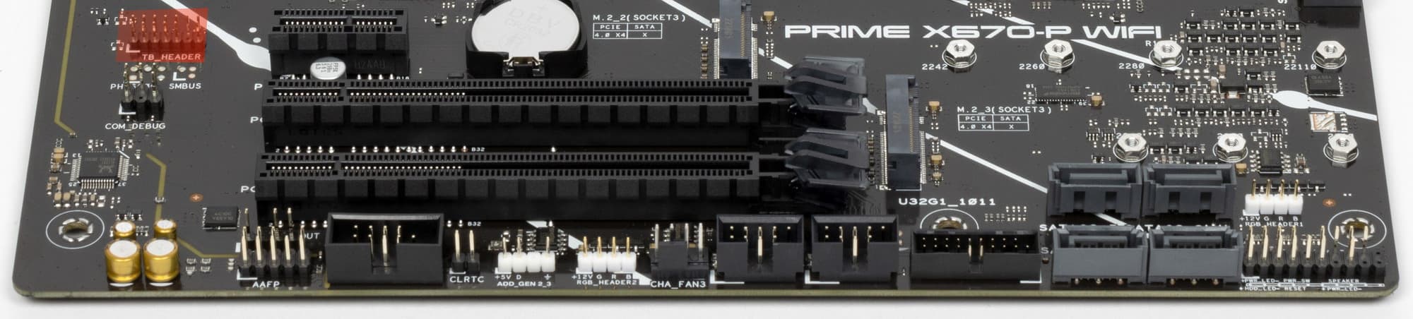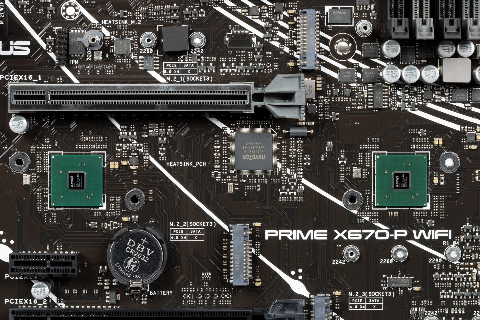 Поддержка периферии у нее неплохая. У Asus Prime X670-P WiFi имеется 19 портов USB разных видов, включая 4 очень быстрых USB 3.2 Gen2, а также USB 3.2 Gen2×2 в виде внутреннего порта Type-C. Плата предлагает слот PCIe х16, который получает от процессора 16 линий PCIe версии 4.0, и еще два «длинных» слота PCIe, но уже PCIe 4.0 x4, плюс один слот PCIe x1 (остальные три слота подключены к чипсету). Также у платы в сумме 3 слота M.2: два из них подключены напрямую к процессору линиями PCIe 5.0 и 4.0, третий подключен к чипсету X670 линиями PCIe 4.0.