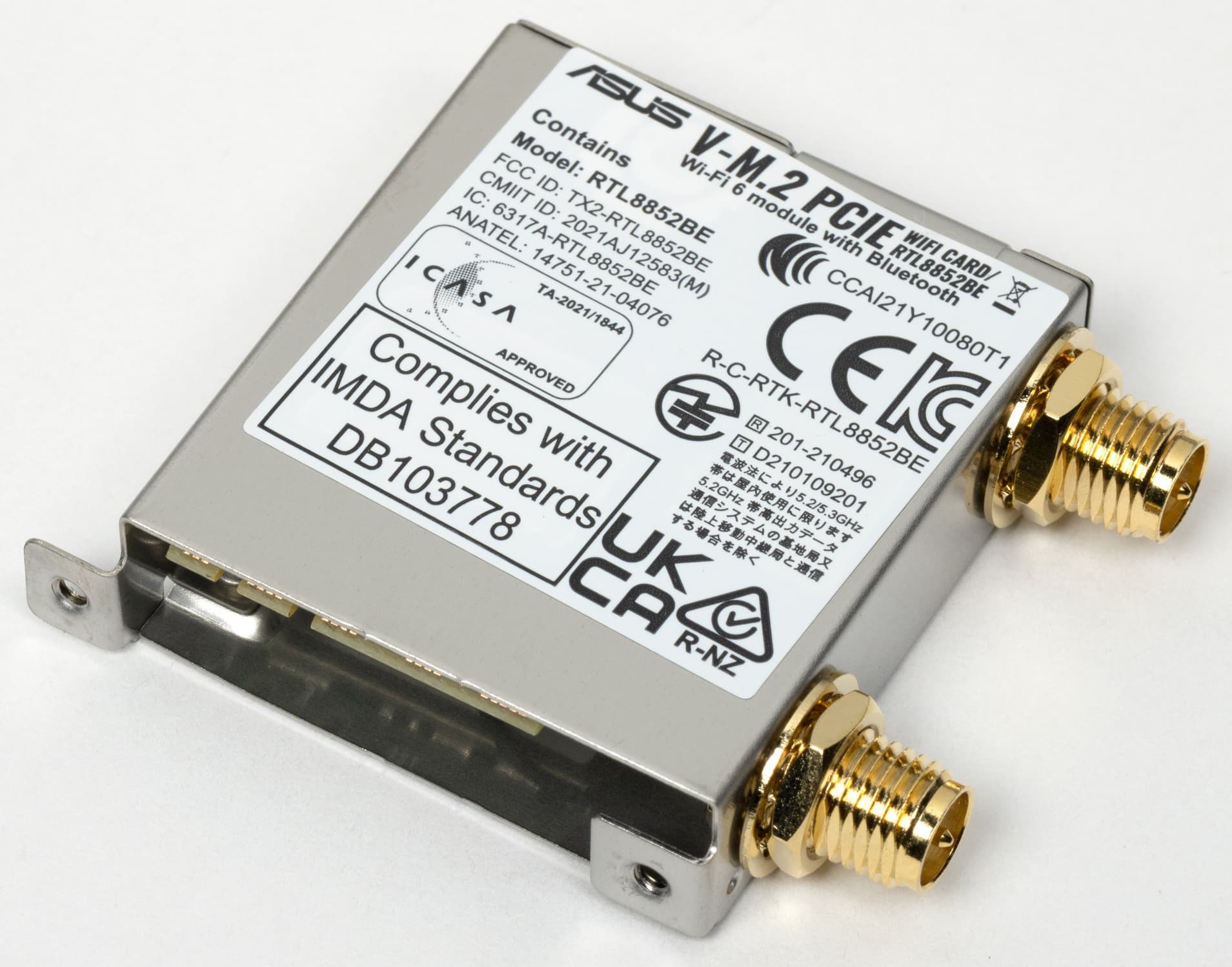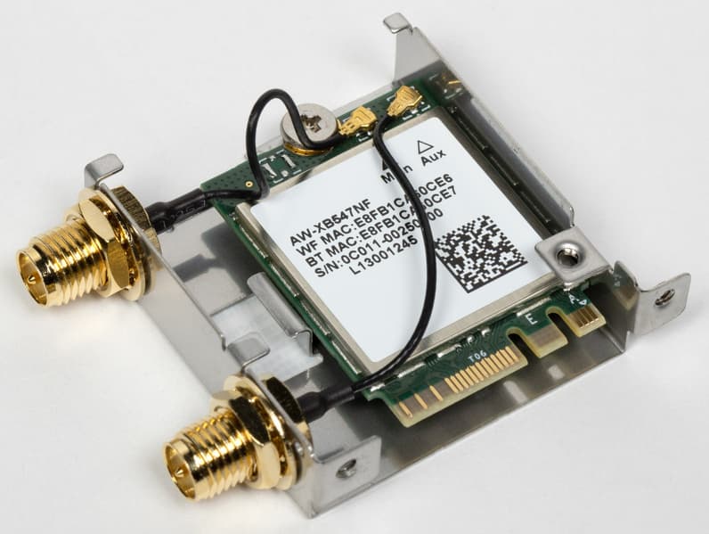 Имеется и комплексный беспроводной адаптер на контроллере Realtek RTL8852, через который реализованы Wi-Fi 6E (802.11a/b/g/n/ac/ax) и Bluetooth 5.2. Он установлен в слот M.2 (E-key), и его разъемы для привинчивания выносных антенн выведены на заднюю панель.