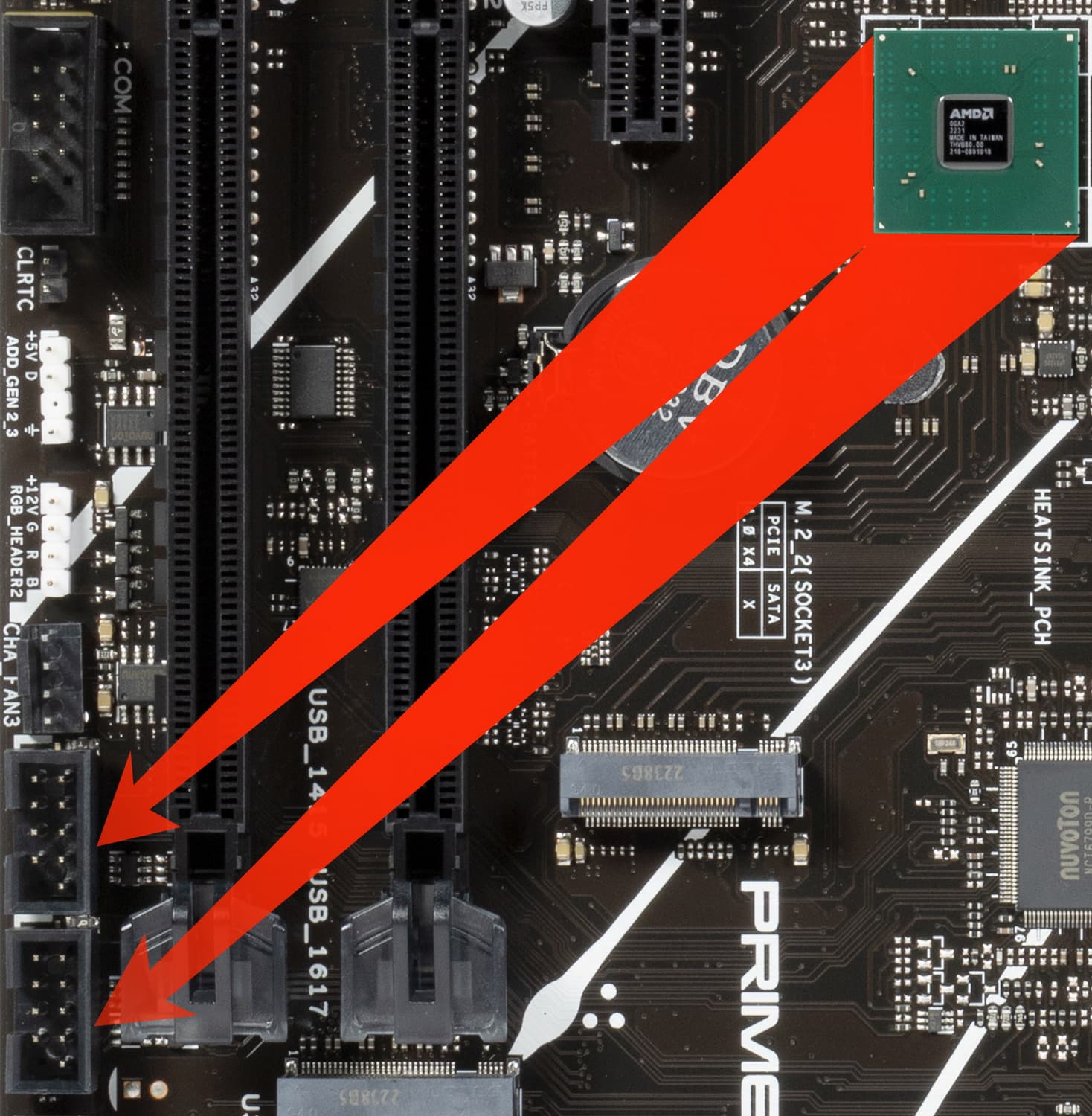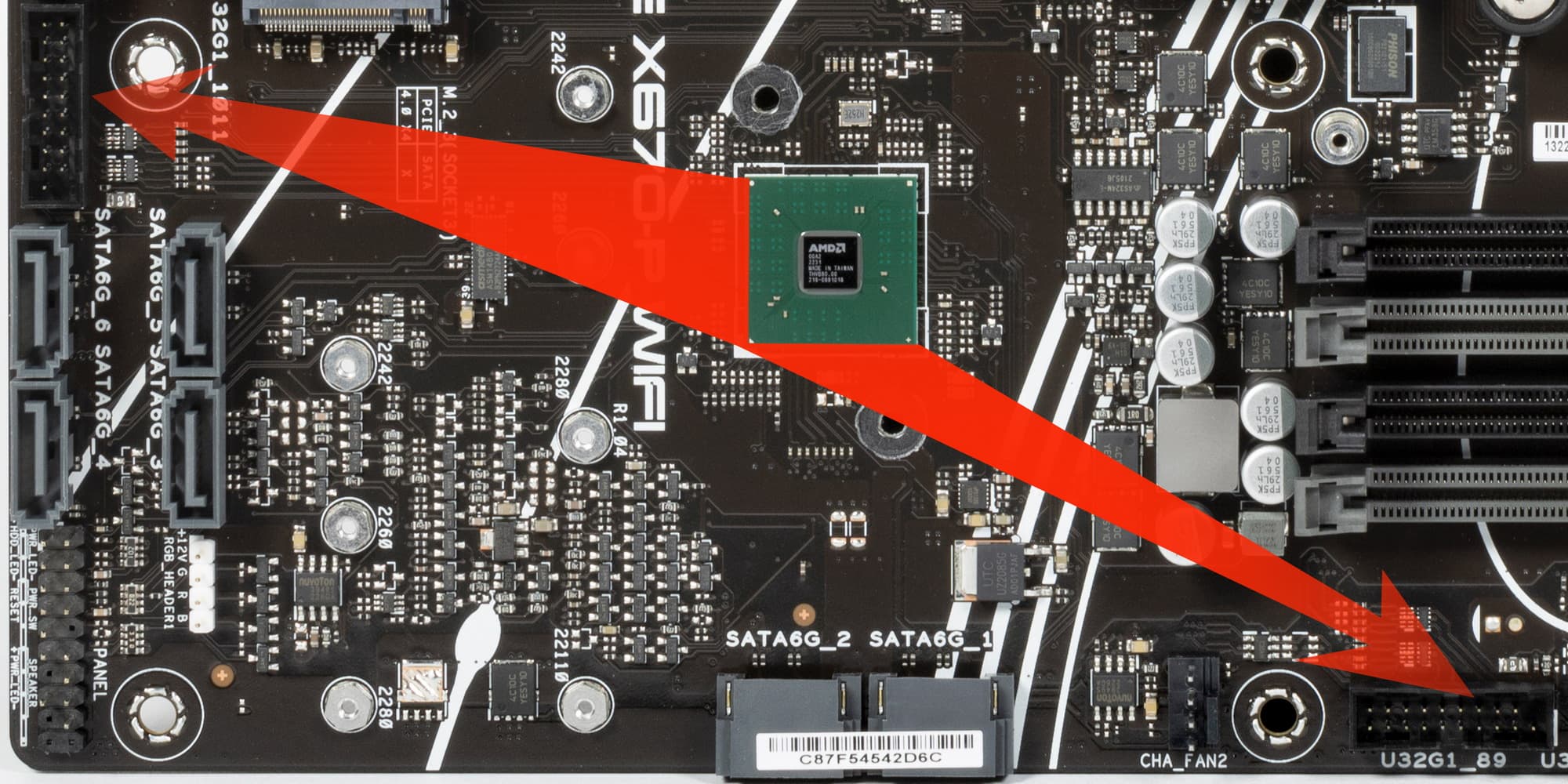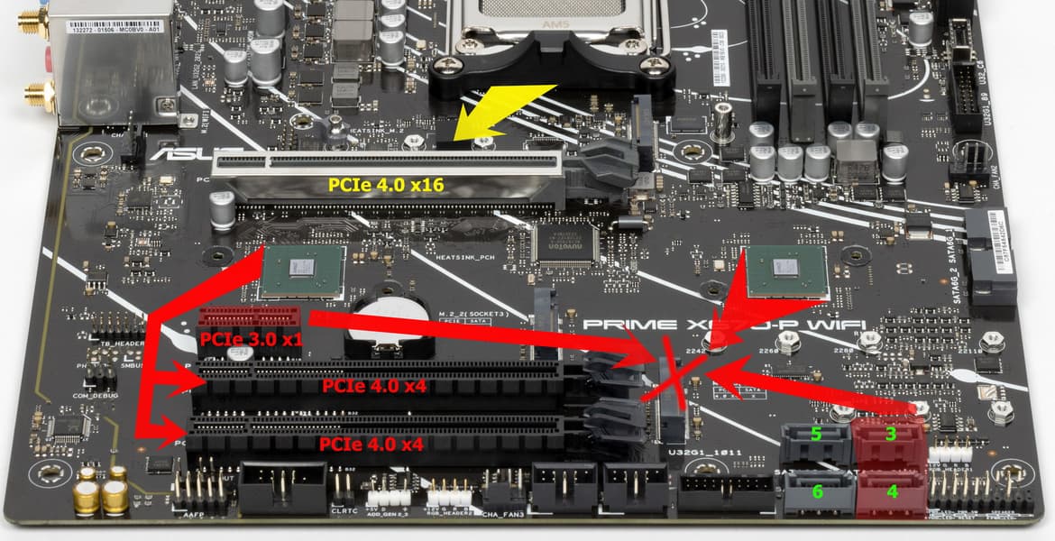 Всего на плате есть 4 слота: три PCIe x16 (для видеокарт или других устройств) и один PCIe x1. Если про первый PCIe x16_1 я выше уже рассказал (он подключен к CPU), то PCIe x16_2/3 и PCIe x1 подключены к X670. Два PCIe x16_2/3, несмотря на форм-фактор, рассчитаны максимум на х4 каждый. А PCIe x1 делит ресурсы с двумя портами SATA: 3/4.