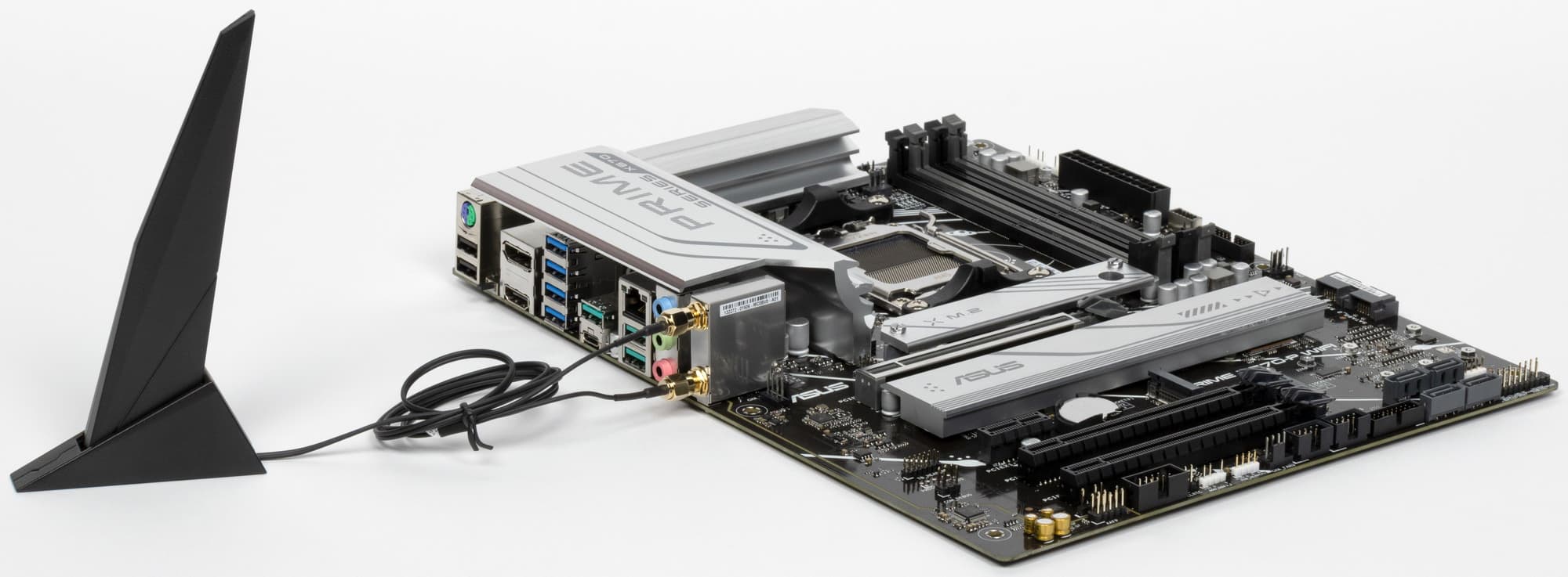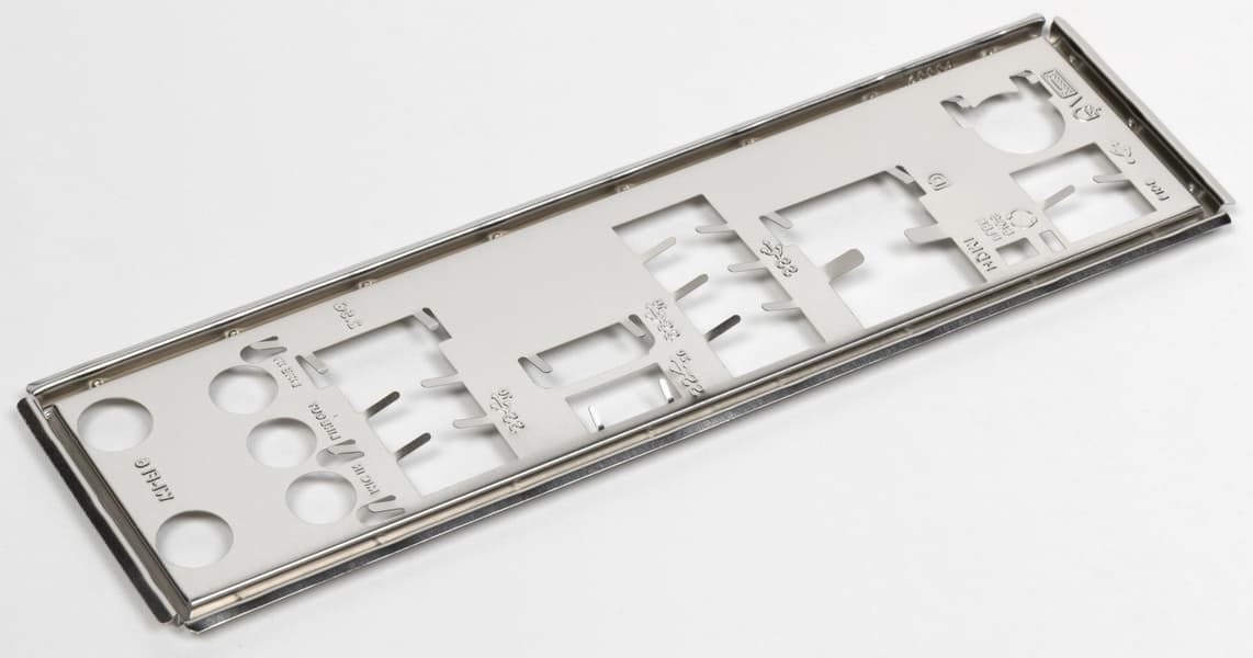 Заглушка, традиционно надеваемая на заднюю панель, в данном случае не установлена на матплате, а поставляется отдельно в комплекте.