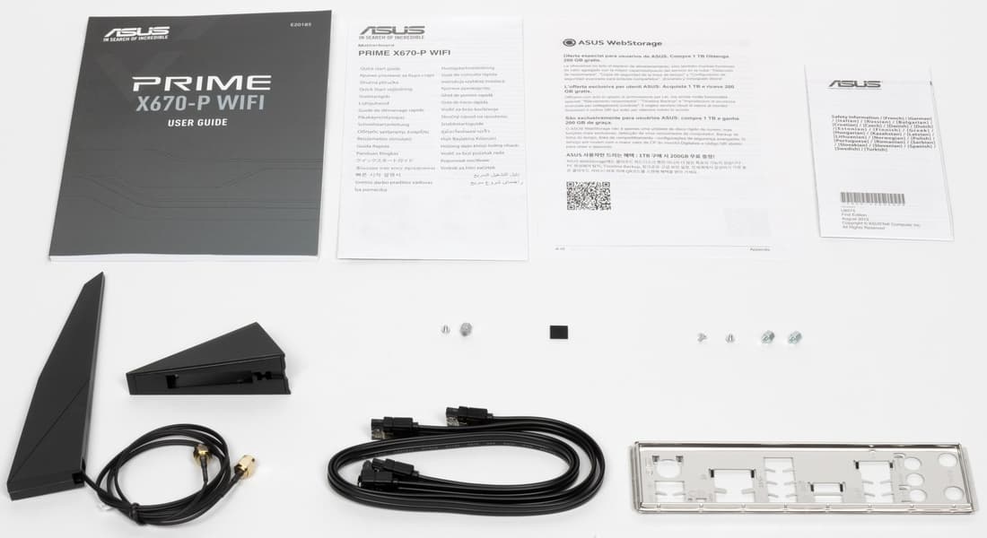 Asus Prime X670-P WiFi поставляется в стандартной коробке фирменного серого дизайна серии Prime. Комплект размещен под платой в отдельном отсеке.