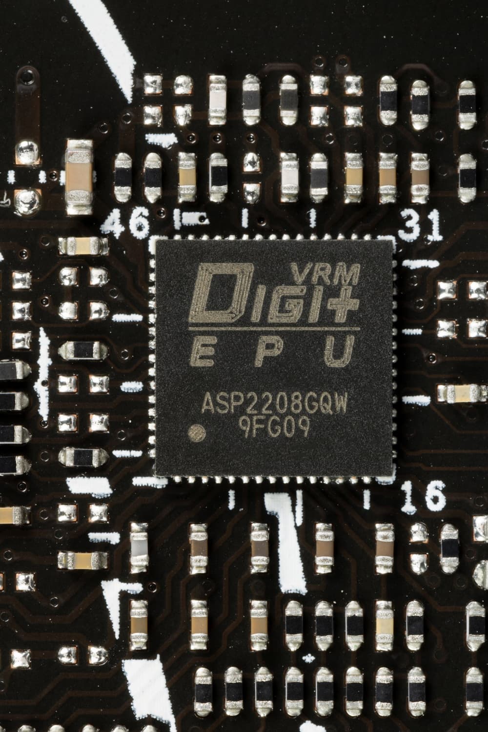 Управляет обоими наборами фаз (12+2) фирменный ШИМ-контроллер DIGI+ ASP2208.