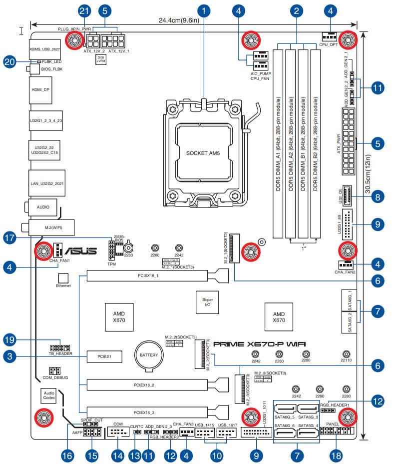 Форм-фактор ATX имеет размеры до 305×244 мм, а E-ATX — до 305×330 мм. Материнская плата Asus Prime X670-P WiFi имеет размеры 305×244 мм, поэтому выполнена в форм-факторе ATX, и на ней имеются 9 монтажных отверстий для установки в корпус. Однако следует иметь в виду, что одно из девяти монтажных отверстий перекрыто радиатором для слота M.2.