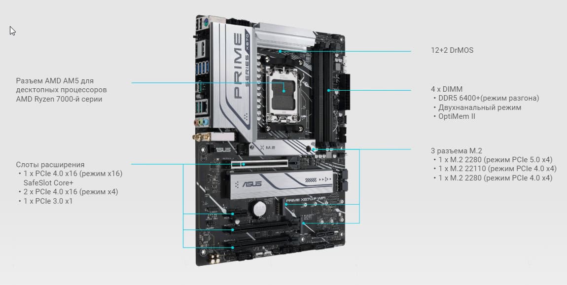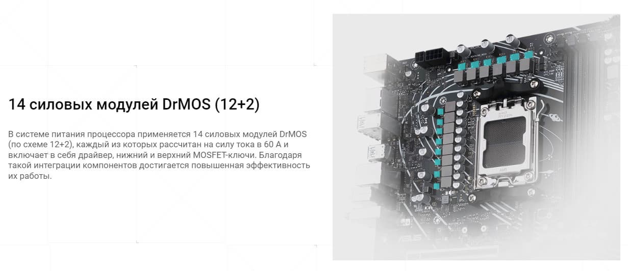 Плата Asus поддерживает процессоры AMD поколения 7000, выполненные под разъем (сокет) AM5.