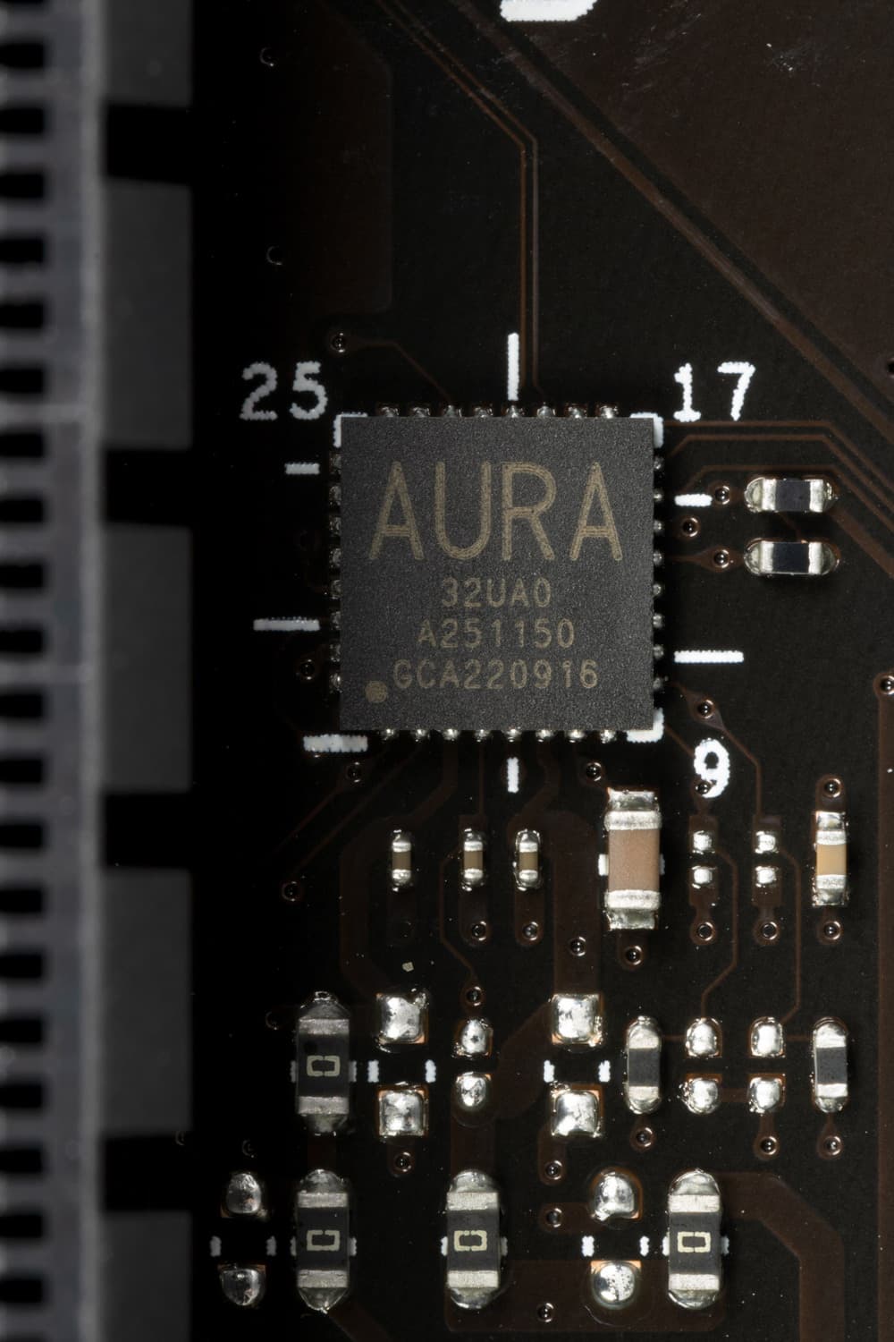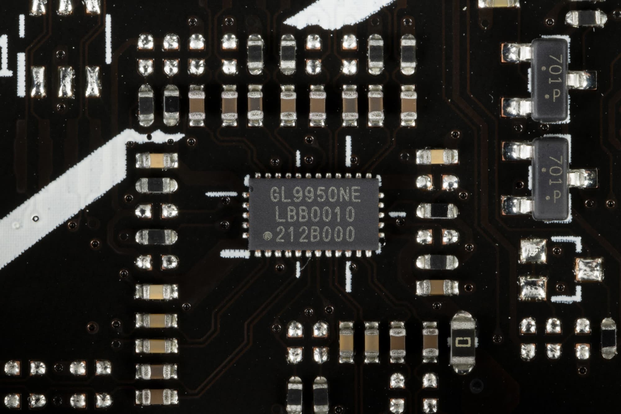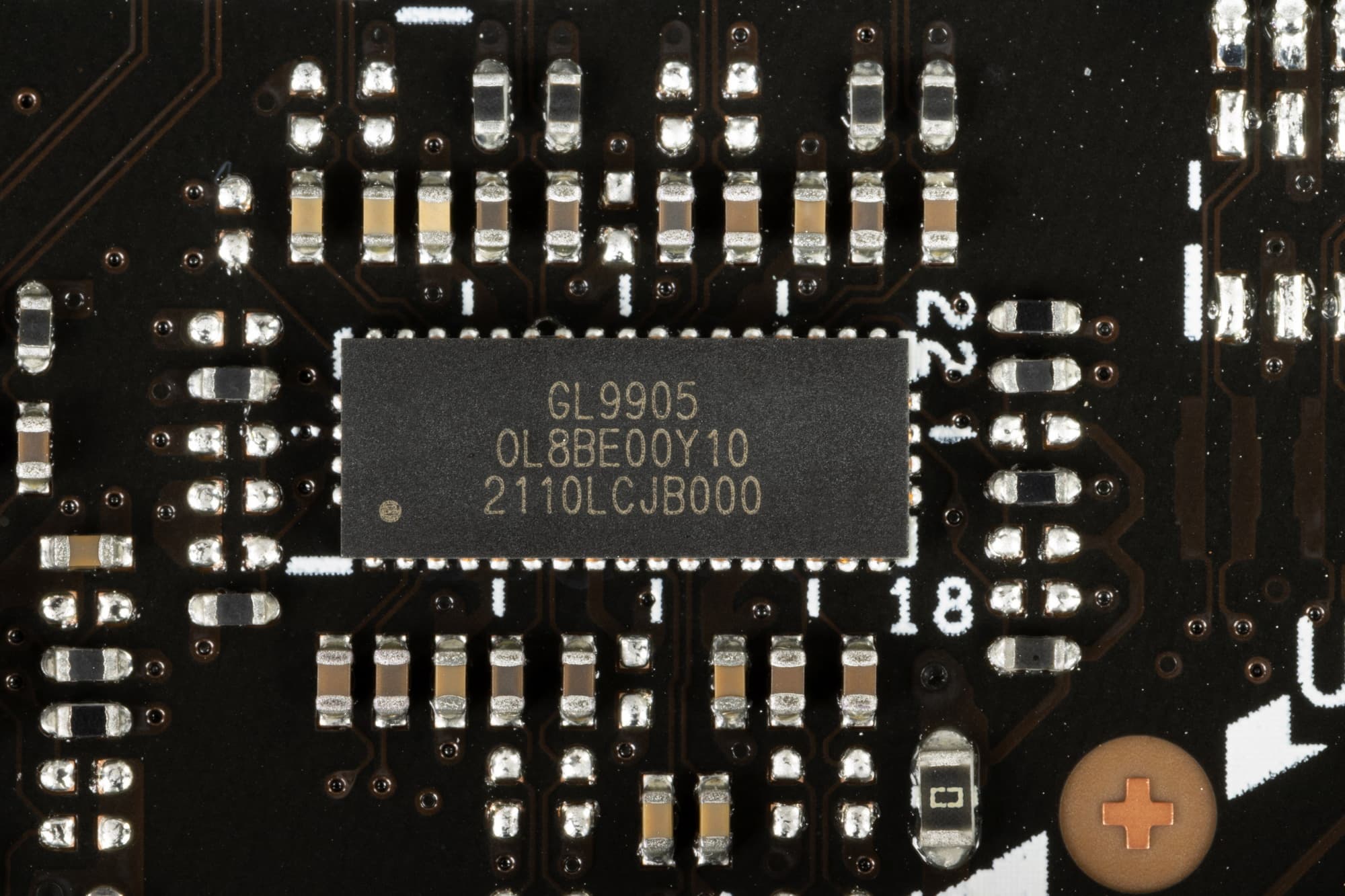 На оборотной стороне расположен только один контроллер и традиционная некоторая логика. Текстолит обработан удовлетворительно: во всех точках пайки острые концы срезаны. Защитной пластины (бэкплейта) нет.