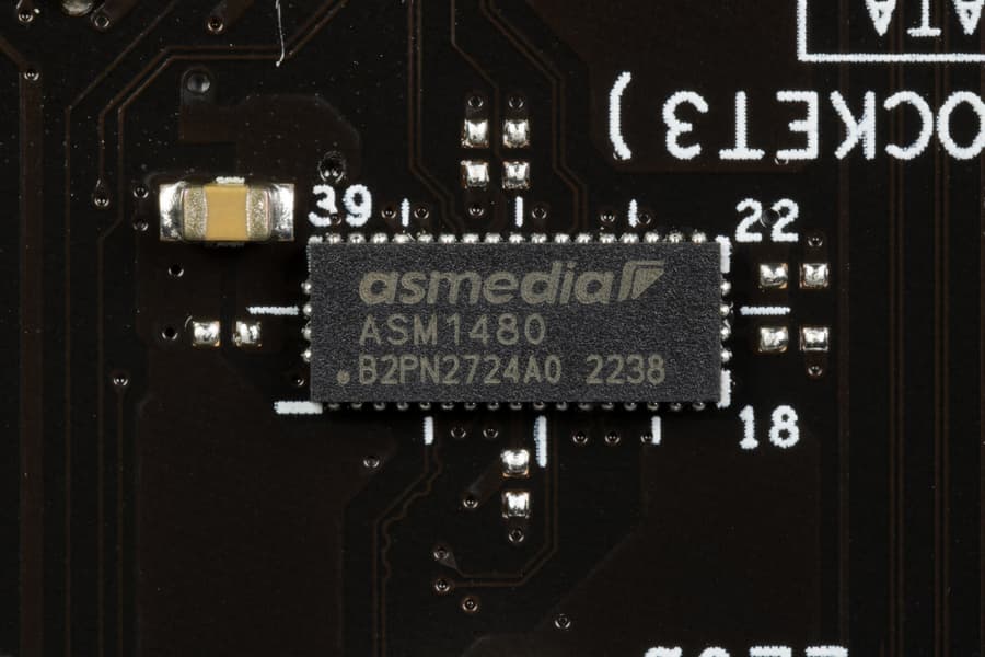 Для реализации данного перераспределения линий PCIe у этой материнки имеется мультиплексор ASMedia.